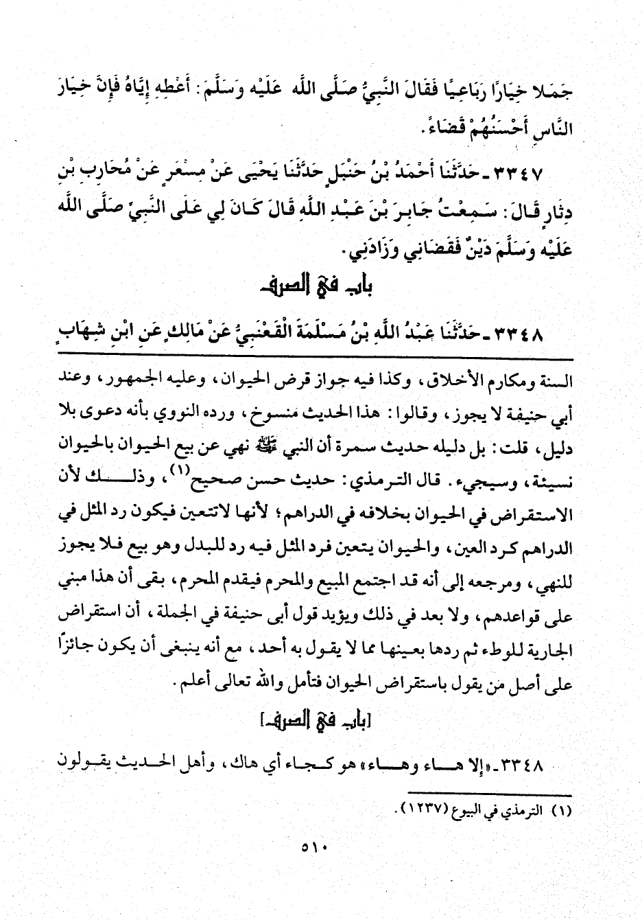 السنة ومكارم الأخلاق، وكذا فيه جواز قرض الحيوان، وعليه الجمهور، وعند أبي حنيفة لا يجوز، وقالوا: هذا الحديث منسوخ، ورده النووي بأنه دعوى بلا دليل، قلت: بل دليله حديث سمرة أن النبي - صلى الله عليه وسلم - نهي عن بيع الحيوان بالحيوان نسيئة، وسيجيء. قال الترمذي: حديث حسن صحيح (¬1)، وذلك لأن الاستقراض في الحيوان بخلافه في الدراهم؛ لأنها لا تتعين فيكون رد المثل في الدراهم كرد العين، والحيوان يتعين فرد المثل فيه رد للبدل وهو بيع فلا يجوز للنهي، ومرجعه إلى أنه قد اجتمع المبيع والمحرم فيقدم المحرم، بقى أن هذا مبني على قواعدهم، ولا بعد في ذلك ويؤيد قول أبي حنيفة في الجملة، أن استقراض الجارية للوطء ثم ردها بعينها مما لا يقول به أحد، مغ أنه ينبغي أن يكون جائزًا على أصل من يقول باستقراض الحيوان فتأمل والله تعالى أعلم.