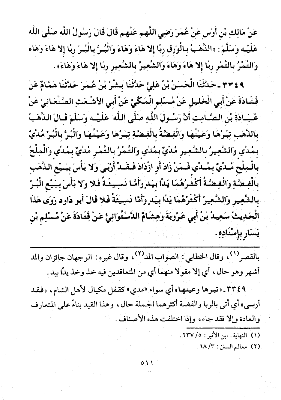3349 - حَدَّثَنَا الْحَسَنُ بْنُ عَلِيٍّ، حَدَّثَنَا بِشْرُ بْنُ عُمَرَ، حَدَّثَنَا هَمَّامٌ، عَنْ قَتَادَةَ، عَنْ أَبِي الْخَلِيلِ، عَنْ مُسْلِمٍ الْمَكِّيِّ، عَنْ أَبِي الْأَشْعَثِ الصَّنْعَانِيِّ، عَنْ عُبَادَةَ بْنِ الصَّامِتِ، أَنَّ رَسُولَ اللَّهِ صَلَّى اللهُ عَلَيْهِ وَسَلَّمَ قَالَ: «الذَّهَبُ بِالذَّهَبِ تِبْرُهَا وَعَيْنُهَا، وَالْفِضَّةُ بِالْفِضَّةِ تِبْرُهَا وَعَيْنُهَا، وَالْبُرُّ بِالْبُرِّ مُدْيٌ بِمُدْيٍ، وَالشَّعِيرُ بِالشَّعِيرِ مُدْيٌ بِمُدْيٍ، وَالتَّمْرُ بِالتَّمْرِ مُدْيٌ بِمُدْيٍ، وَالْمِلْحُ بِالْمِلْحِ مُدْيٌ بِمُدْيٍ، فَمَنْ زَادَ أَوِ ازْدَادَ فَقَدْ أَرْبَى، وَلَا بَأْسَ بِبَيْعِ الذَّهَبِ، بِالْفِضَّةِ وَالْفِضَّةُ أَكْثَرُهُمَا يَدًا بِيَدٍ، وَأَمَّا نَسِيئَةً فَلَا، وَلَا بَأْسَ بِبَيْعِ الْبُرِّ بِالشَّعِيرِ، وَالشَّعِيرُ أَكْثَرُهُمَا يَدًا بِيَدٍ، وَأَمَّا نَسِيئَةً فَلَا»، قَالَ أَبُو دَاوُدَ: رَوَى هَذَا الْحَدِيثَ سَعِيدُ بْنُ أَبِي عَرُوبَةَ، وَهِشَامٌ الدَّسْتُوَائِيُّ، عَنْ قَتَادَةَ، عَنْ مُسْلِمِ بْنِ يَسَارٍ، بِإِسْنَادِهِ.