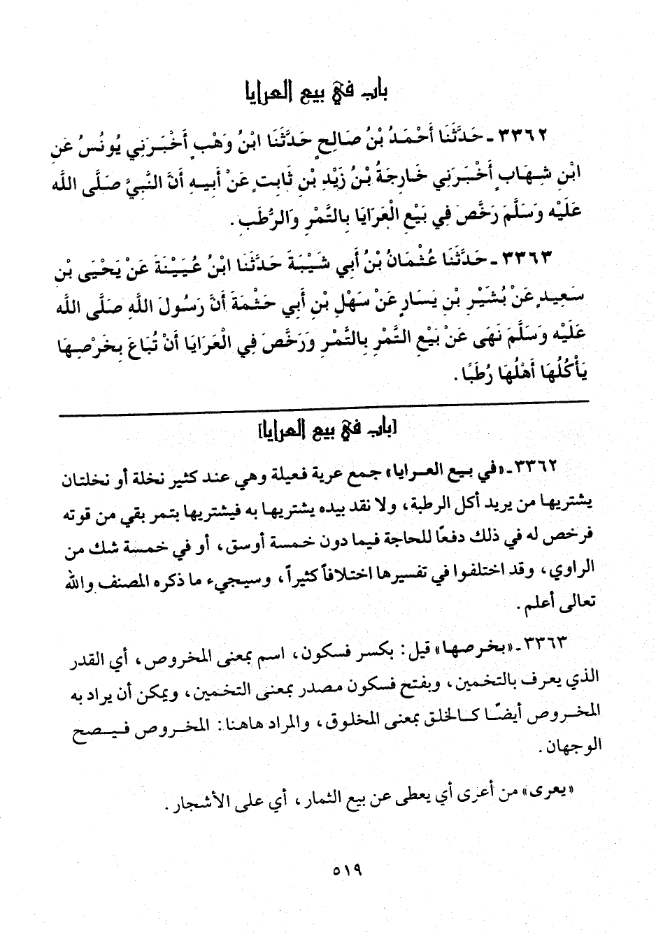 3362 - "في بيع العرايا" جمع عرية فعيلة وهي عند كثر نخلة أو نخلتان يشتريها من يريد أكل الرطبة، ولا نقد بيده يشتريها به فيشتريها بتمر بقي من قوته فرخص له في ذلك دفعًا للحاجة فيما دون خمسة أوسق، أو في خمسة شك من الراوي، وقد اختلفوا في تفسيرها اختلافًا كثيرًا، وسيجيء ما ذكره المصنف والله تعالى أعلم.