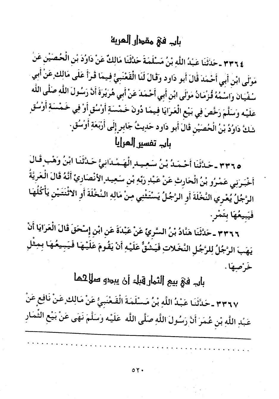 3367 - حَدَّثَنَا عَبْدُ اللَّهِ بْنُ مَسْلَمَةَ الْقَعْنَبِيُّ، عَنْ مَالِكٍ، عَنْ نَافِعٍ، عَنْ عَبْدِ اللَّهِ بْنِ عُمَرَ: "أَنَّ رَسُولَ اللَّهِ صَلَّى اللهُ عَلَيهِ وَسَلَّمَ نَهَى عَنْ بَيعِ الثِّمَارِ