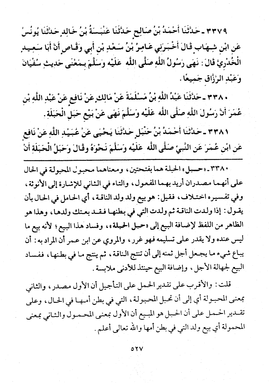 3381 - حَدَّثَنَا أَحْمَدُ بْنُ حَنْبَلٍ، حَدَّثَنَا يَحْيَى، عَنْ عُبَيْدِ اللَّهِ، عَنْ نَافِعٍ، عَنِ ابْنِ عُمَرَ، عَنِ النَّبِيِّ صَلَّى اللهُ عَلَيْهِ وَسَلَّمَ نَحْوَهُ، وَقَالَ: «وَحَبَلُ الْحَبَلَةِ، أَنْ