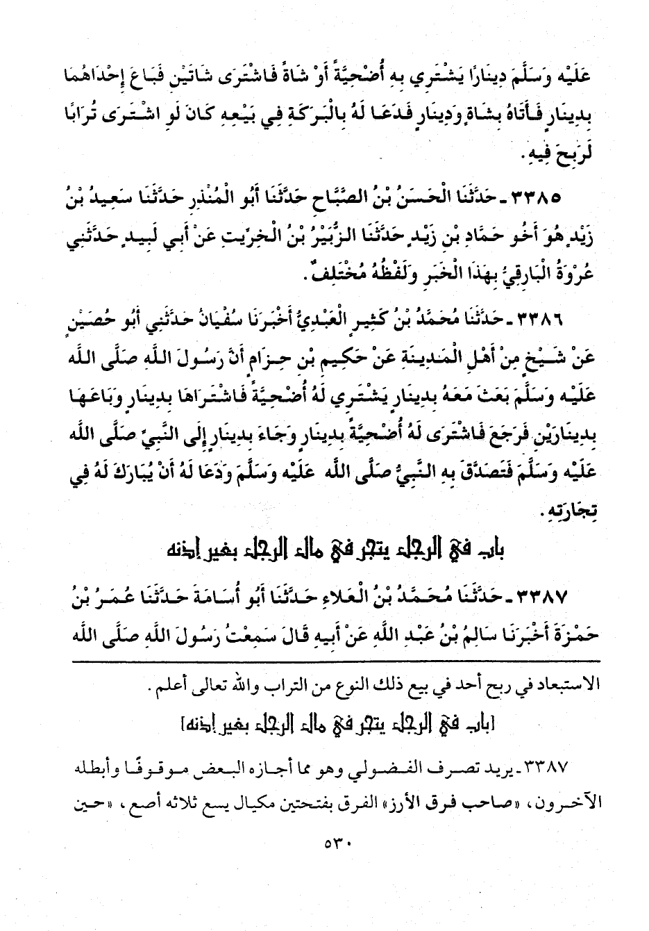 3386 - حَدَّثَنَا مُحَمَّدُ بْنُ كَثِيرٍ الْعَبْدِيُّ، أَخْبَرَنَا سُفْيَانُ، حَدَّثَنِي أَبُو حُصَيْنٍ، عَنْ شَيْخٍ، مِنْ أَهْلِ الْمَدِينَةِ، عَنْ حَكِيمِ بْنِ حِزَامٍ: «أَنَّ رَسُولَ اللَّهِ صَلَّى اللهُ عَلَيْهِ وَسَلَّمَ بَعَثَ مَعَهُ بِدِينَارٍ يَشْتَرِي لَهُ أُضْحِيَّةً، فَاشْتَرَاهَا بِدِينَارٍ، وَبَاعَهَا بِدِينَارَيْنِ، فَرَجَعَ فَاشْتَرَى لَهُ أُضْحِيَّةً بِدِينَارٍ، وَجَاءَ بِدِينَارٍ، إِلَى النَّبِيِّ صَلَّى اللهُ عَلَيْهِ وَسَلَّمَ فَتَصَدَّقَ بِهِ النَّبِيُّ صَلَّى اللهُ عَلَيْهِ وَسَلَّمَ وَدَعَا لَهُ أَنْ يُبَارَكَ لَهُ فِي تِجَارَتِهِ».