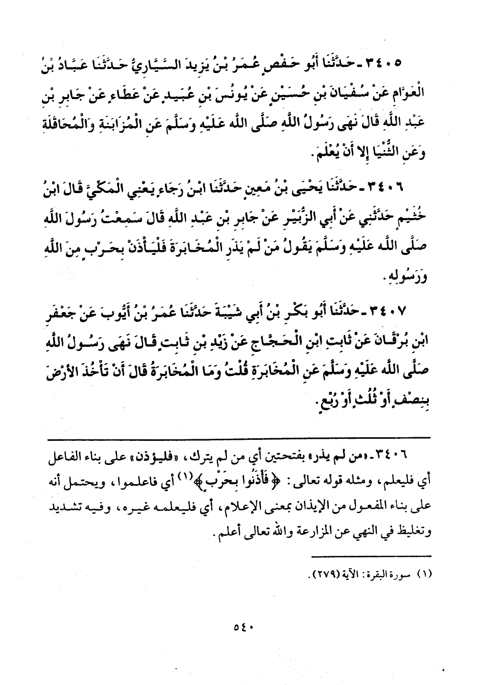 3406 - حَدَّثَنَا يَحْيَى بْنُ مَعِينٍ، حَدَّثَنَا ابْنُ رَجَاءٍ يَعْنِي الْمَكِّيَّ، قَالَ ابْنُ خُثَيْمٍ: حَدَّثَنِي عَنْ أَبِي الزُّبَيْرِ، عَنْ جَابِرِ بْنِ عَبْدِ اللَّهِ، قَالَ: سَمِعْتُ رَسُولَ اللَّهِ صَلَّى اللهُ عَلَيْهِ وَسَلَّمَ يَقُولُ: «مَنْ لَمْ يَذَرْ الْمُخَابَرَةَ فَلْيَأْذَنْ بِحَرْبٍ مِنَ اللَّهِ وَرَسُولِهِ».