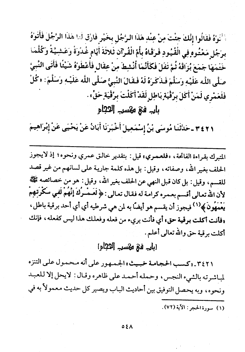 3421 - "كسب الحجامة خبيث" الجمهور على أنه محمول على التنزه لمباشرته بالشيء النجس، وحمله أحمد على ظاهره وقال: لا يحل إلا للعبد ونحوه، وبه يحصل التوفيق بين أحاديث الباب ويصير كل حديث معمولًا به في