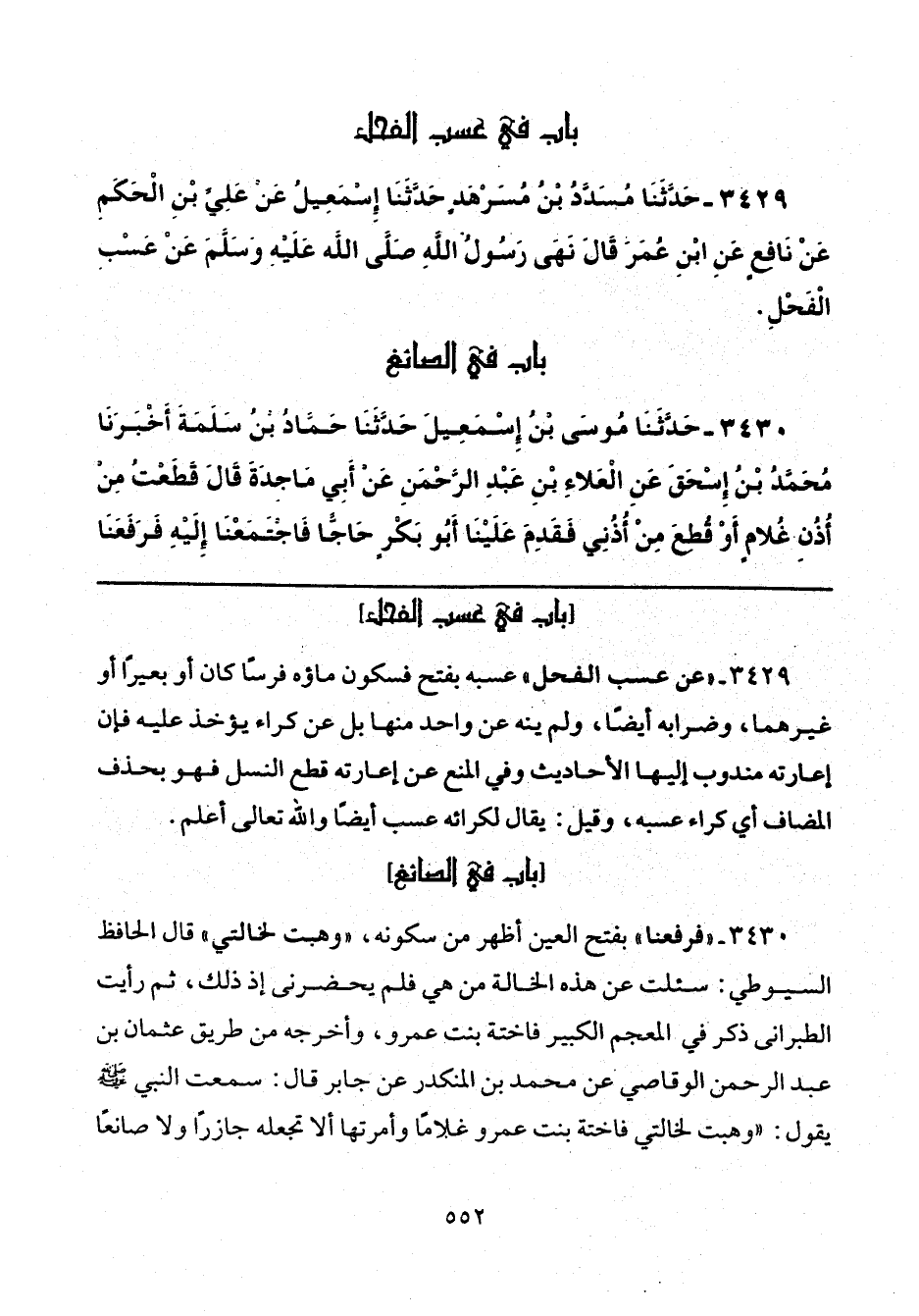 3429 - "عن عسب الفحل" عسبه بفتح فسكون ماؤه فرسًا كان أو بعيرًا أو غيرهما، وضرابه أيضًا، ولم ينه عن واحد منها بل عن كراء يؤخذ عليه فإن إعارته مندوب إليها الأحاديث وفي المنع عن إعارته قطع النسل فهو بحذف المضاف أي كراء عسبه، وقيل: يقال لكرائه عسب أيضًا والله تعالى أعلم.