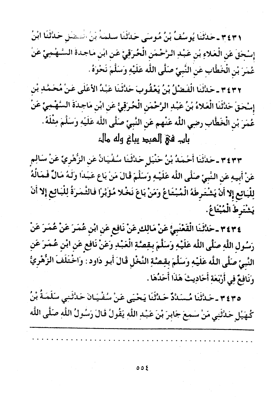 3433 - حَدَّثَنَا أَحْمَدُ بْنُ حَنْبَلٍ، حَدَّثَنَا سُفْيَانُ، عَنِ الزُّهْرِيِّ، عَنْ سَالِمٍ، عَنْ أَبِيهِ، عَنِ النَّبِيِّ صَلَّى اللهُ عَلَيْهِ وَسَلَّمَ قَالَ: «مَنْ بَاعَ عَبْدًا وَلَهُ مَالٌ فَمَالُهُ لِلْبَائِعِ، إِلَّا أَنْ يَشْتَرِطَهُ الْمُبْتَاعُ، وَمَنْ بَاعَ نَخْلًا مُؤَبَّرًا فَالثَّمَرَةُ لِلْبَائِعِ، إِلَّا أَنْ يَشْتَرِطَ الْمُبْتَاعُ».