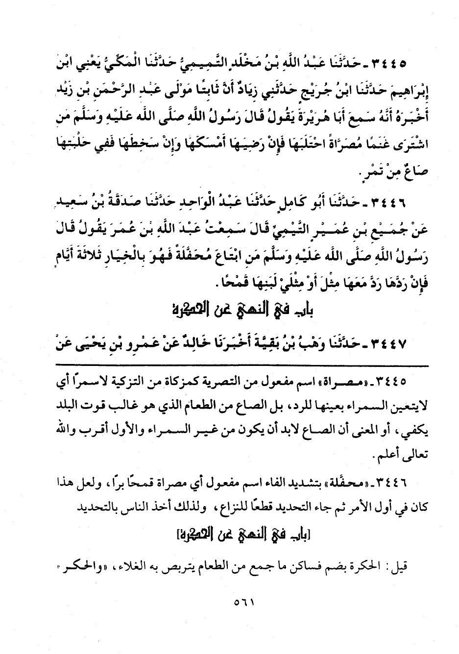 3445 - "مصراة" اسم مفعول من التصرية كمزكاة من التزكية لا سمرًا أي لا يتعين السمراء بعينها للرد، بل الصاع من الطعام الذي هو غالب قوت البلد يكفي، أو المعنى أن الصاع لا بد أن يكون من غير السمراء والأول أقرب والله تعالى أعلم.