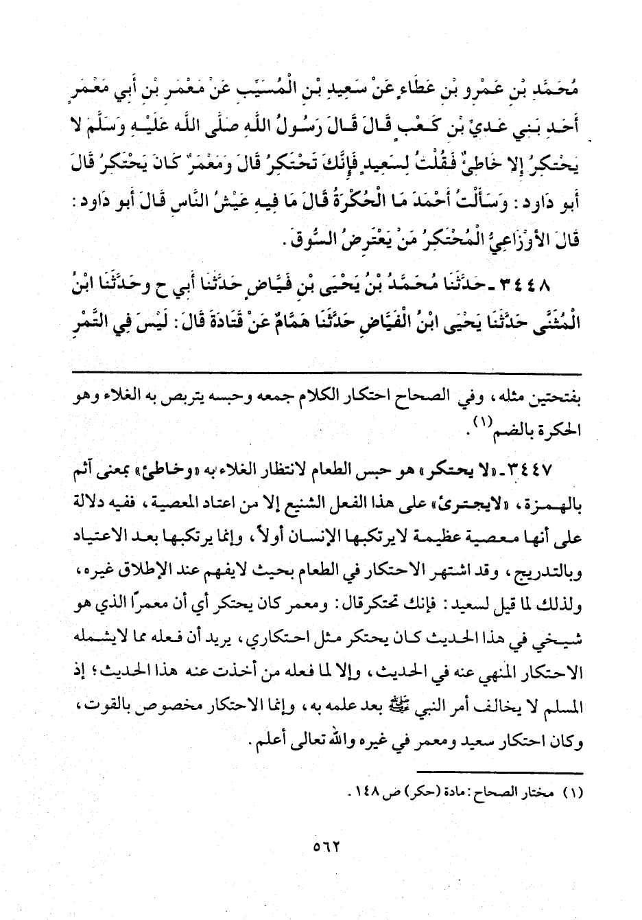 3447 - "لا يحتكر" هو حبس الطعام لانتظار الغلاء به "وخاطئ" بمعنى آثم بالهمزة، "لا يجترئ" على هذا الفعل الشنيع إلا من اعتاد المعصية، ففيه دلالة على أنها معصية عظيمة لا يرتكبها الإنسان أولًا، وإنما يرتكبها بعد الاعتياد وبالتدريج، وقد اشتهر الاحتكار في الطعام بحيث لا يفهم عند الإطلاق غيره، ولذلك لما قيل لسعيد: فإنك تحتكر قال: ومعمر كان يحتكر أي أن معمرًا الذي هو شيخي في هذا الحديث كان يحتكر مثل احتكاري، يريد أن فعله مما لا يشمله الاحتكار المنهي عنه في الحديث، وإلا لما فعله من أخذت عنه هذا الحديث، إذ المسلم لا يخالف أمر النبي - صلى الله عليه وسلم - بعد علمه به، وإنما الاحتكار مخصوص بالقوت، وكان احتكار سعيد ومعمر في غيره والله تعالى أعلم.