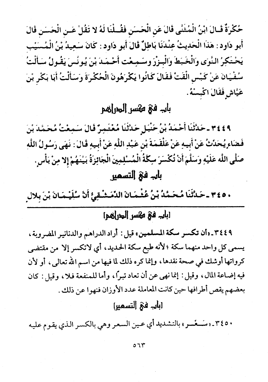 3449 - "أن تكسر سكة المسلمين" قيل: أراد الدراهم والدنانير المضروبة، يسمى كل واحد منهما سكة؛ لأنه طبع سكة الحديد، أي لا تكسر إلا من مقتضى كرواتها أو شك في صحة نقدها، وإنما كره ذلك لما فيها من اسم الله تعالى، أو لأن فيه إضاعة المال، وقيل: إنما نهى عن أن تعاد تبرًا، وأما للمنفعة فلا، وقيل: كان بعضهم يقص أطرافها حين كانت المعاملة عدد الأوزان فنهوا عن ذلك.