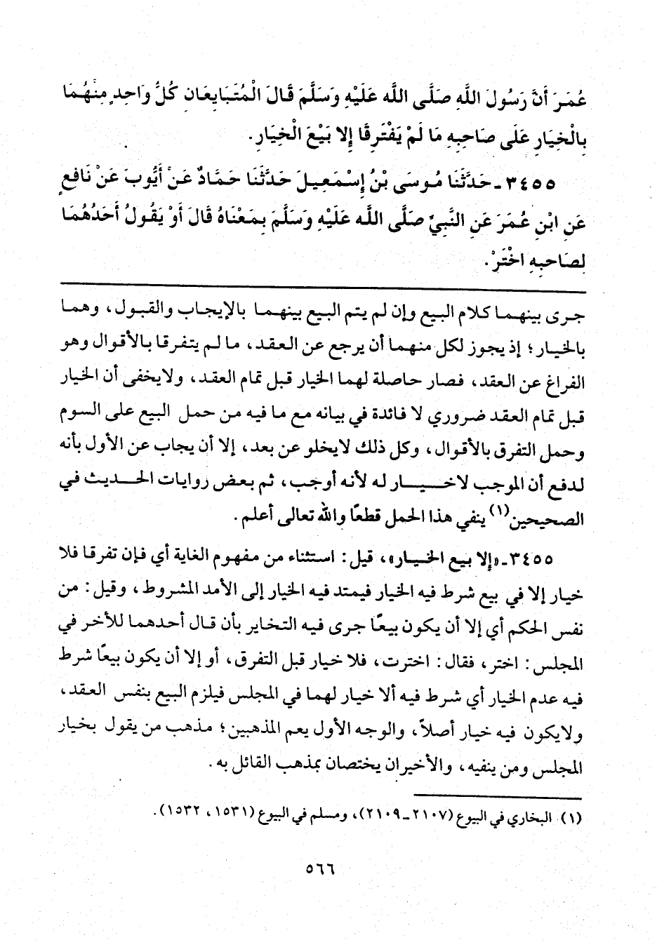 3455 - "إلا بيع الخيار"، قيل: استثناء من مفهوم الغاية أي فإن تفرقا فلا خيار إلا في بيع شرط فيه الخيار فيمتد فيه الخيار إلى الأمد المشروط، وقيل: من نفس الحكم أي إلا أن يكون بيعًا جرى فيه التخاير بأن قال أحدهما للآخر في المجلس: اختر، فقال: اخترت، فلا خيار قبل التفرق، أو إلا أن يكون بيعًا شرط فيه عدم الخيار أي شرط فيه ألا خيار لهما في المجلس فيلزم البيع بنفس العقد، ولا يكون فيه خيار أصلًا، والوجه الأول يعم المذهبين، مذهب من يقول بخيار المجلس ومن ينفيه، والأخيران يختصان بمذهب القائل به.