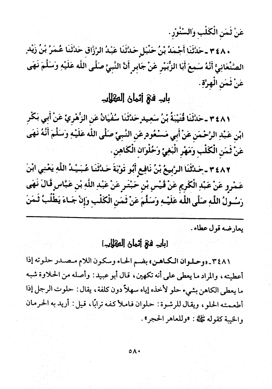 3481 - حَدَّثَنَا قُتَيْبَةُ بْنُ سَعِيدٍ، حَدَّثَنَا سُفْيَانُ، عَنِ الزُّهْرِيِّ، عَنْ أَبِي بَكْرِ بْنِ عَبْدِ الرَّحْمَنِ، عَنْ أَبِي مَسْعُودٍ: عَنْ «النَّبِيِّ صَلَّى اللهُ عَلَيْهِ وَسَلَّمَ أَنَّهُ نَهَى عَنْ ثَمَنِ الْكَلْبِ، وَمَهْرِ الْبَغِيِّ، وَحُلْوَانِ الْكَاهِنِ».