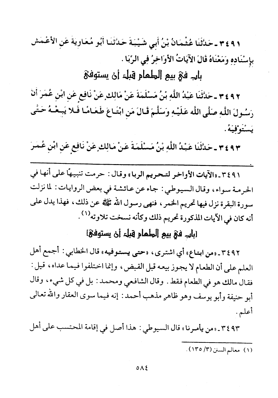 3492 - "من ابتاع" أي اشترى، "حتى يستوفيه" قال الخطابي: أجمع أهل العلم على أن الطعام لا يجوز بيعه قبل القبض، وإنما اختلفوا فيما عداه، قيل: فقال مالك هو في الطعام فقط. وقال الشافعي ومحمد: بل في كل شيء، وقال أبو حنيفة وأبو يوسف وهو ظاهر مذهب أحمد: إنه فيما سوى العقار والله تعالى أعلم.