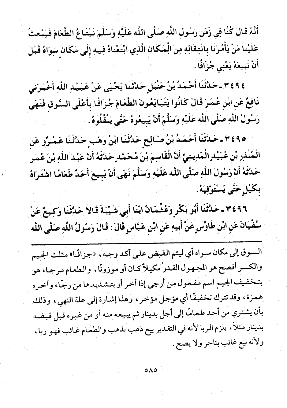 السوق إلى مكان سواه أي ليتم القبض على آكد وجه، "جزافًا" مثلث الجيم والكسر أفصح هو المجهول القدر مكيلًا كان أو موزونًا، والطعام مرجاء هو بتخفيف الجيم اسم مفعول من أرجى إذا أخر أو بتشديدها من رجّاء وآخره همزة، وقد تترك تخفيفًا أي مؤجل مؤخر، وهذا إشارة إلى علة النهي، وذلك بأن يشتري من أحد طعامًا إلى أجل بدينار ثم يبيعه منه أو من غيره قبل قبضه بدينار مثلًا، يلزم الربا لأنه في التقدير بيع ذهب بذهب والطعام غائب فهو ربا، ولأنه بيع غائب بناجز ولا يصح.