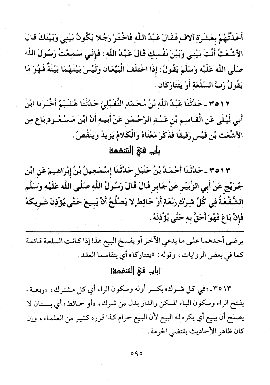 3513 - حَدَّثَنَا أَحْمَدُ بْنُ حَنْبَلٍ، حَدَّثَنَا إِسْمَاعِيلُ بْنُ إِبْرَاهِيمَ، عَنِ ابْنِ جُرَيْجٍ، عَنْ أَبِي الزُّبَيْرِ، عَنْ جَابِرٍ، قَالَ: قَالَ رَسُولُ اللَّهِ صَلَّى اللهُ عَلَيْهِ وَسَلَّمَ: «الشُّفْعَةُ فِي كُلِّ شِرْكٍ رَبْعَةٍ، أَوْ حَائِطٍ لَا يَصْلُحُ أَنْ يَبِيعَ، حَتَّى يُؤْذِنَ شَرِيكَهُ، فَإِنْ بَاعَ فَهُوَ أَحَقُّ بِهِ حَتَّى يُؤْذِنَهُ».