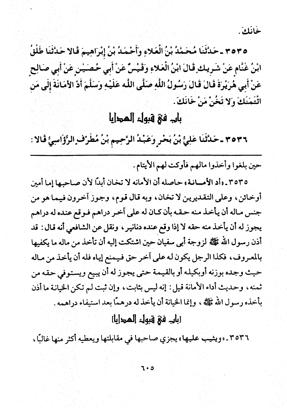 3535 - "أد الأمانة" حاصله أن الأمانة لا تخان أبدًا لأن صاحبها إما أمين أو خائن، وعلى التقديرين لا تخان، وبه قال قوم، وجوز آخرون فيما هو من جنس ماله أن يأخذ منه حقه بأن كان له على آخر دراهم فوقع عنده له دراهم يجوز له أن يأخذ منه حقه لا إذا وقع عنده دنانير، ونقل عن الشافعي أنه قال: قد أذن رسول الله - صلى الله عليه وسلم - لزوجة أبي سفيان حين اشتكت إليه أن تأخذ من ماله ما يكفيها بالمعروف، فكذا الرجل يكون له على آخر حق فيمنع إياه فله أن يأخذ من ماله حيث وجده بوزنه أو بكيله أو بالقيمة حتى يجوز له أن يبيع ويستوفي حقه من ثمنه، وحديث أداء الأمانة قيل: إنه ليس بثابت، وإن ثبت لم تكن الخيانة ما أذن بأخذه رسول الله - صلى الله عليه وسلم -، وإنما الخيانة أن يأخذ له درهمًا بعد استيفاء دراهمه.