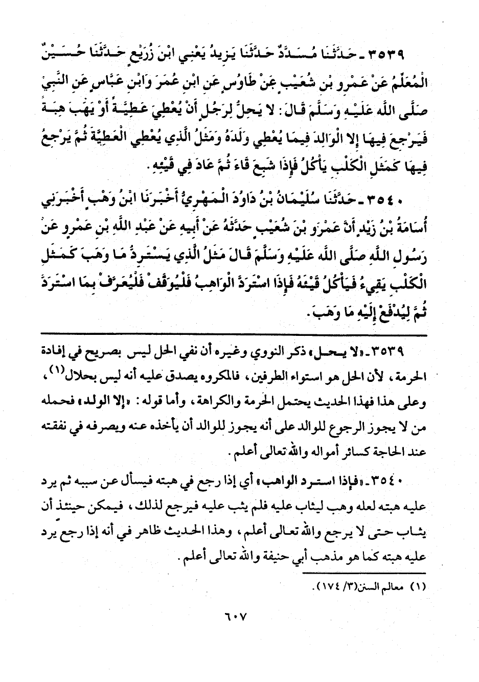 3539 - "لا يحل" ذكر النووي وغيره أن نفي الحل ليس بصريح في إفادة الحرمة، لأن الحل هو استواء الطرفين، فالمكروه يصدق عليه أنه ليس بحلال (¬1)، وعلى هذا فهذا الحديث يحتمل الحرمة والكراهة، وأما قوله: "إلا الولد" فحمله من لا يجوز الرجوع للوالد على أنه يجوز للوالد أن يأخذه عنه ويصرفه في نفقته عند الحاجة كسائر أمواله والله تعالى أعلم.