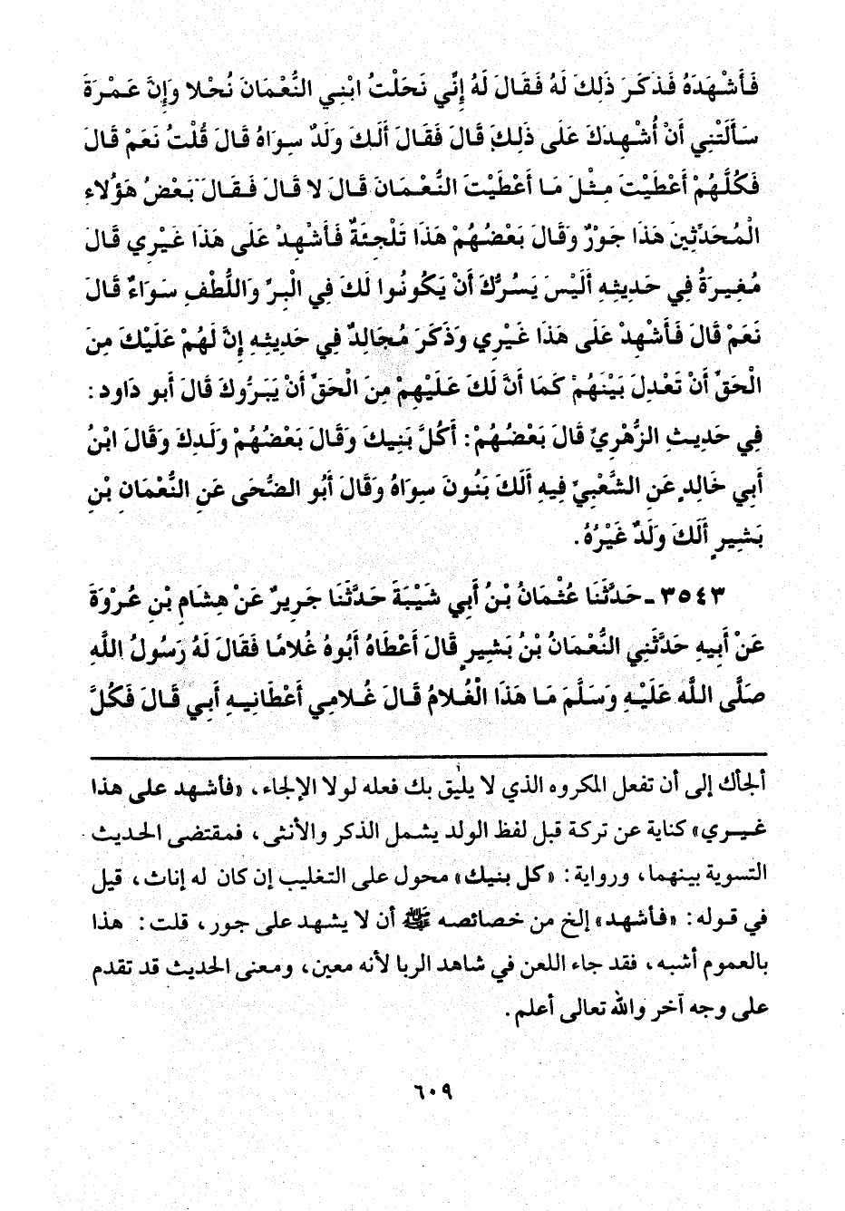 3543 - حَدَّثَنَا عُثْمَانُ بْنُ أَبِي شَيْبَةَ، حَدَّثَنَا جَرِيرٌ، عَنْ هِشَامِ بْنِ عُرْوَةَ، عَنْ أَبِيهِ، حَدَّثَنِي النُّعْمَانُ بْنُ بَشِيرٍ، قَالَ: أَعْطَاهُ أَبُوهُ غُلَامًا، فَقَالَ لَهُ رَسُولُ اللَّهِ صَلَّى اللهُ عَلَيْهِ وَسَلَّمَ: «مَا هَذَا الْغُلَامُ؟ » قَالَ: غُلَامِي أَعْطَانِيهِ أَبِي، قَالَ: «فَكُلَّ