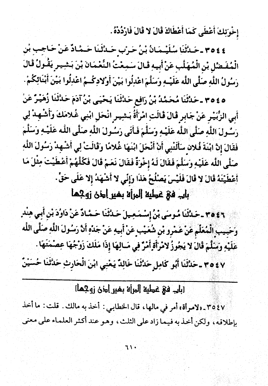 3544 - حَدَّثَنَا سُلَيْمَانُ بْنُ حَرْبٍ، حَدَّثَنَا حَمَّادٌ، عَنْ حَاجِبِ بْنِ الْمُفَضَّلِ بْنِ الْمُهَلَّبِ، عَنْ أَبِيهِ، قَالَ: سَمِعْتُ النُّعْمَانَ بْنَ بَشِيرٍ، يَقُولُ: قَالَ رَسُولُ اللَّهِ صَلَّى اللهُ عَلَيْهِ وَسَلَّمَ: «اعْدِلُوا بَيْنَ أَوْلَادِكُمُ اعْدِلُوا بَيْنَ أَبْنَائِكُمْ».