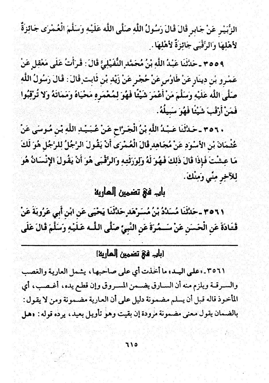 3561 - "على اليد" ما أخذت أي على صاحبها، يشمل العارية والغصب والسرقة ويلزم منه أن السارق يضمن المسروق وإن قطع يده، أغصب، أي المأخوذ قاله قبل أن يسلم مضمونة دليل على أن العارية مضمونة ومن لا يقول: بالضمان يقول معنى مضمونة مزودة إن بقيت وهو تأويل بعيد، يرده قوله: "هل