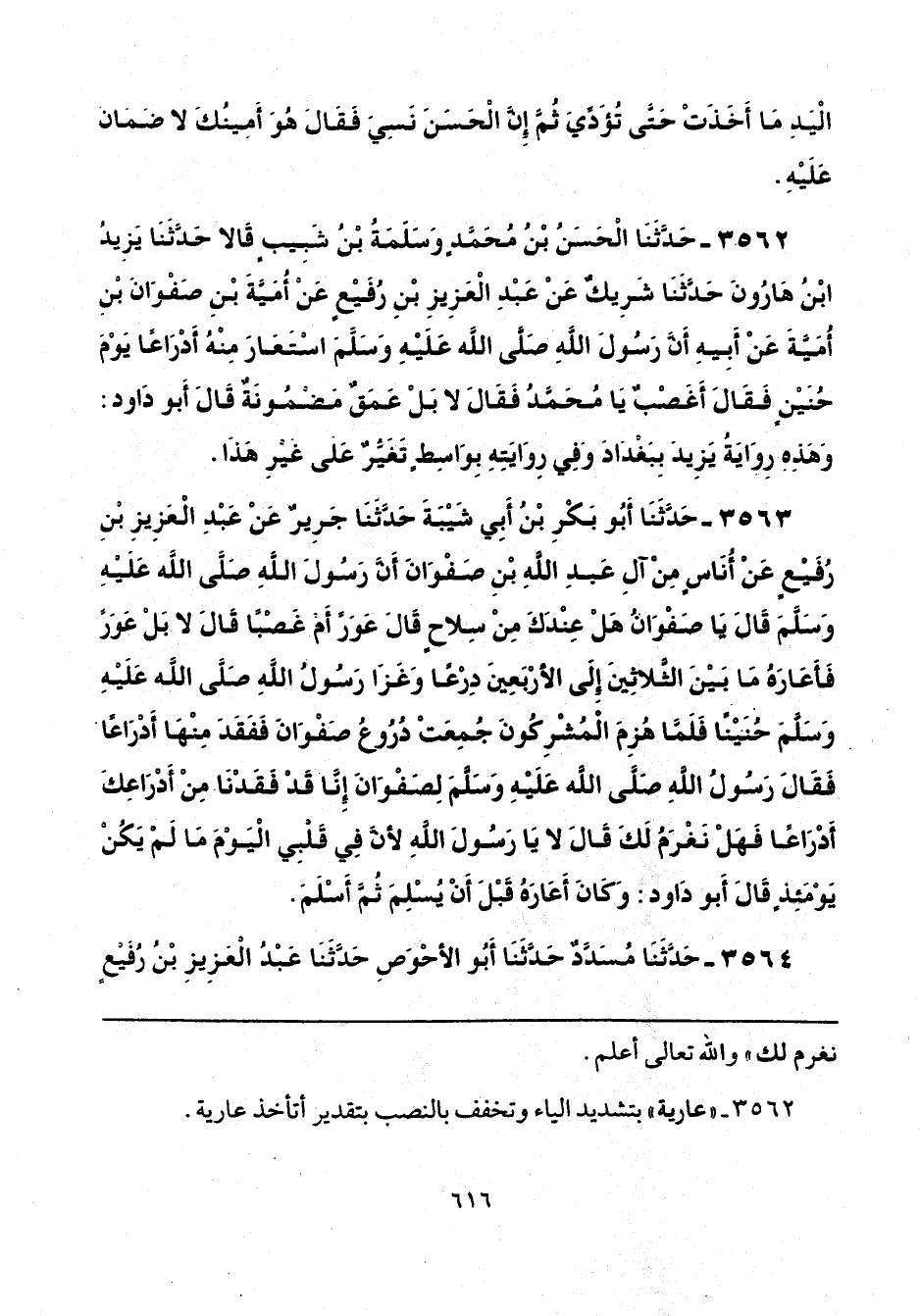 3562 - حَدَّثَنَا الْحَسَنُ بْنُ مُحَمَّدٍ، وَسَلَمَةُ بْنُ شَبِيبٍ، قَالَا: حَدَّثَنَا يَزِيدُ بْنُ هَارُونَ، حَدَّثَنَا شَرِيكٌ، عَنْ عَبْدِ الْعَزِيزِ بْنِ رُفَيْعٍ، عَنْ أُمَيَّةَ بْنِ صَفْوَانَ بْنِ أُمَيَّةَ، عَنْ أَبِيهِ، أَنَّ رَسُولَ اللَّهِ صَلَّى اللهُ عَلَيْهِ وَسَلَّمَ اسْتَعَارَ مِنْهُ أَدْرَاعًا يَوْمَ حُنَيْنٍ فَقَالَ: أَغَصْبٌ يَا مُحَمَّدُ، فَقَالَ: «لَا، بَلْ عَمَقٌ مَضْمُونَةٌ»، قَالَ أَبُو دَاوُدَ: «وَهَذِهِ رِوَايَةُ يَزِيدَ بِبَغْدَادَ وَفِي رِوَايَتِهِ بِوَاسِطٍ تَغَيُّرٌ عَلَى غَيْرِ هَذَا».