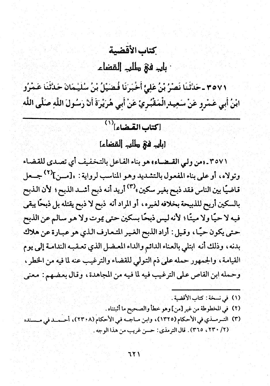 3571 - "من ولي القضاء" هو بناء الفاعل بالتخفيف أي تصدى للقضاء وتولاه، أو على بناء المفعول بالتشديد وهو المناسب لرواية: " [من] (¬2) جعل قاضيًا بين الناس فقد ذبح بغير سكين" (¬3) أريد أنه ذبح أشد الذبح؛ لأن الذبح بالسكين أريح للذبيحة بخلافه لغيره، أو المراد أنه ذبح لا ذبح يقتله بل ذبحًا يبقى فيه لا حيًّا ولا ميتًا؛ لأنه ليس ذبحًا بسكين حتى يموت ولا هو سالم عن الذبح حتى يكون حيًّا، وقيل: أراد الذبح الغير المتعارف الذي هو عبارة عن هلاك بدنه، وذلك أنه ابتلي بالعناء الدائم والداء المعضل الذي تعقبه الندامة إلى يوم القيامة، والجمهور حمله على ذم التولي للقضاء والترغيب عنه لما فيه من الخطر، وحمله ابن القاص على الترغيب فيه لما فيه من المجاهدة، وقال بعضهم: معنى