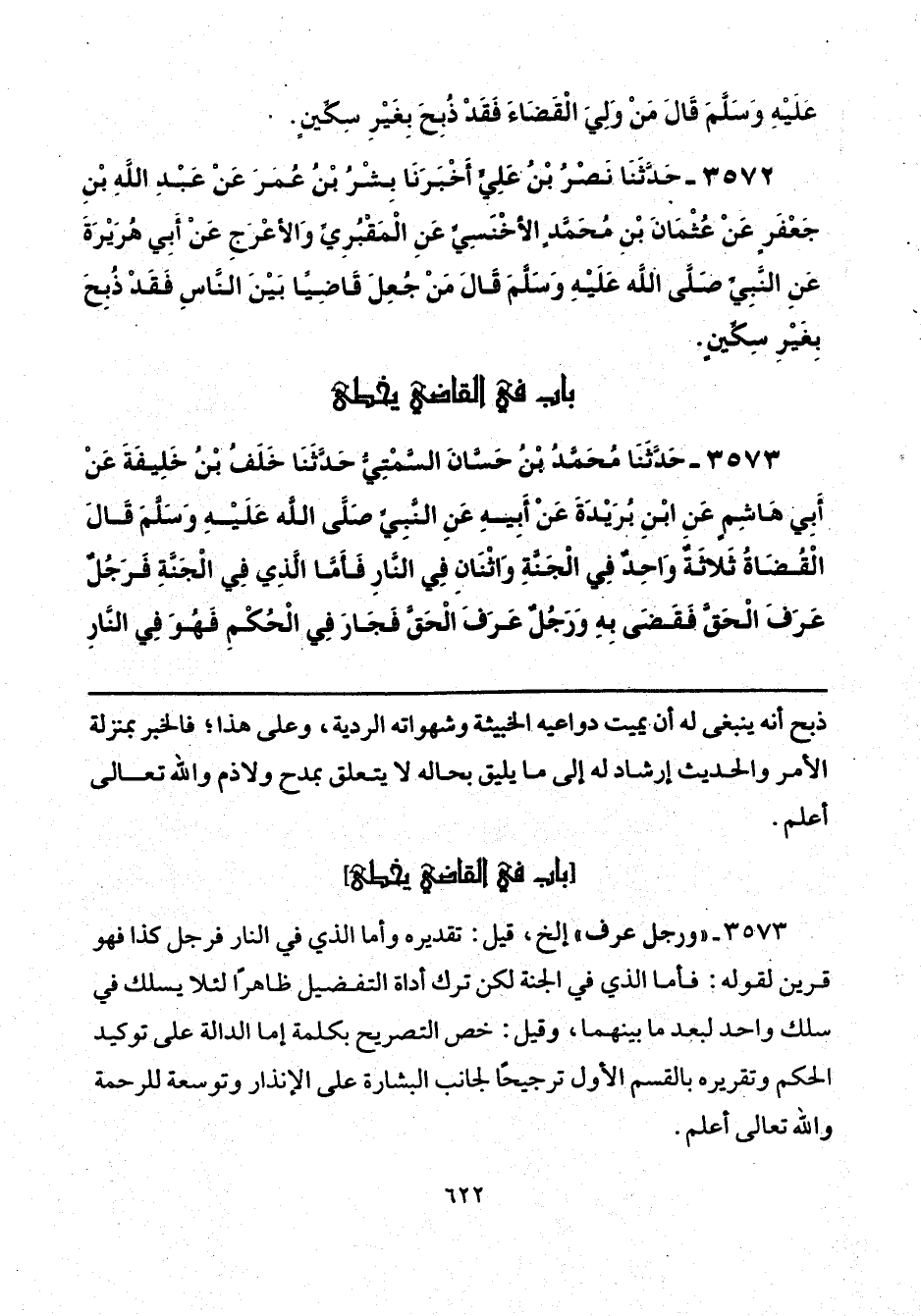 3573 - حَدَّثَنَا مُحَمَّدُ بْنُ حَسَّانَ السَّمْتِيُّ، حَدَّثَنَا خَلَفُ بْنُ خَلِيفَةَ، عَنْ أَبِي هَاشِمٍ، عَنِ ابْنِ بُرَيْدَةَ، عَنْ أَبِيهِ، عَنِ النَّبِيِّ صَلَّى اللهُ عَلَيْهِ وَسَلَّمَ قَالَ: الْقُضَاةُ ثَلَاثَةٌ: وَاحِدٌ فِي الْجَنَّةِ، وَاثْنَانِ فِي النَّارِ، فَأَمَّا الَّذِي فِي الْجَنَّةِ فَرَجُلٌ عَرَفَ الْحَقَّ فَقَضَى بِهِ، وَرَجُلٌ عَرَفَ الْحَقَّ فَجَارَ فِي الْحُكْمِ، فَهُوَ فِي النَّارِ،