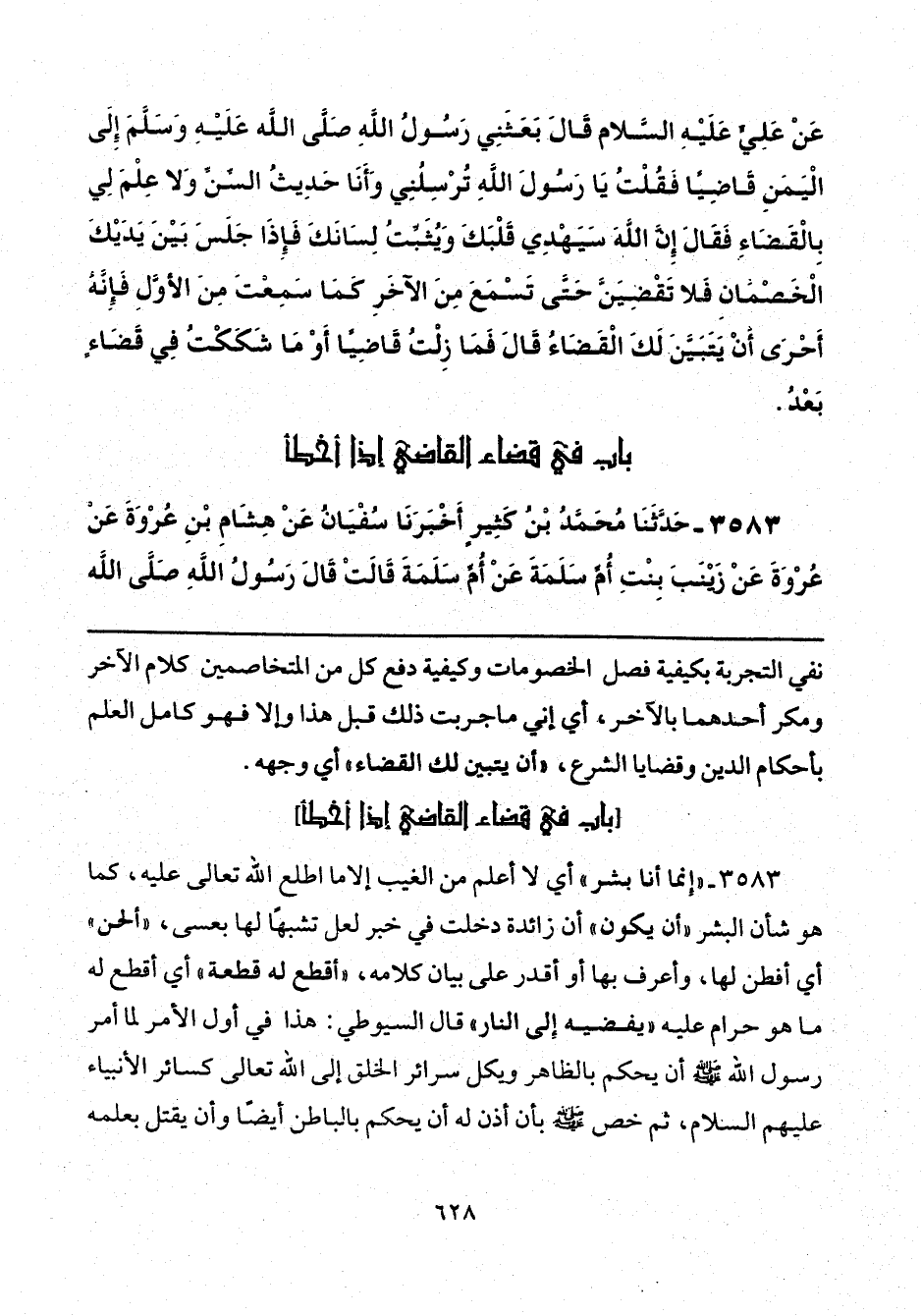 3583 - "إنما أنا بشر" أي لا أعلم من الغيب إلاما اطلع الله تعالى عليه، كما هو شأن البشر "أن يكون" أن زائدة دخلت في خبر لعل تشبهًا لها بعسى، "ألحن" أي أفطن لها، وأعرف بها أو أقدر على بيان كلامه، "أقطع له قطعة" أي أقطع له ما هو حرام عليه "يفضيه إلى النار" قال السيوطي: هذا في أول الأمر لما أمر رسول الله - صلى الله عليه وسلم - أن يحكم بالظاهر ويكل سرائر الخلق إلى الله تعالى كسائر الأنبياء عليهم السلام، ثم خص - صلى الله عليه وسلم - بأن أذن له أن يحكم بالباطن أيضًا وأن يقتل بعلمه