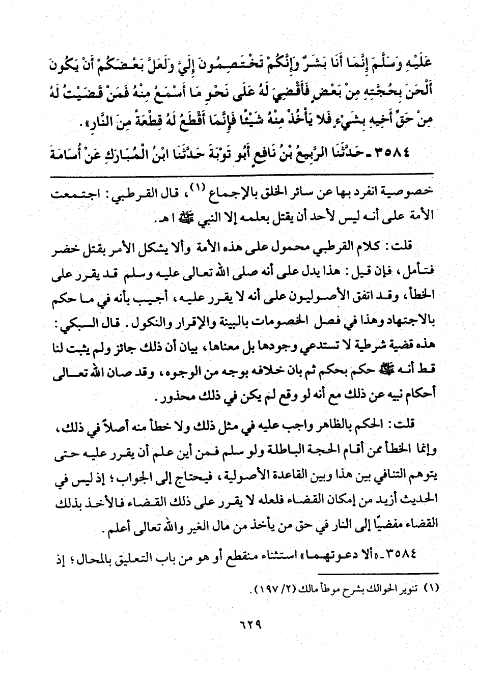 قلت: كلام القرطبي محمول على هذه الأمة وألا يشكل الأمر بقتل خضر فتأمل، فإن قيل: هذا يدل على أنه صلى الله تعالى عليه وسلم قد يقرر على الخطأ، وقد اتفق الأصوليون على أنه لا يقرر عليه، أجيب بأنه في ما حكم بالاجتهاد وهذا في فصل الخصومات بالبينة والإقرار والنكول. قال السبكي: هذه قضية شرطية لا تستدعي وجودها بل معناها، بيان أن ذلك جائز ولم يثبت لنا قط أنه - صلى الله عليه وسلم - حكم بحكم ثم بان خلافه بوجه من الوجوه، وقد صان الله تعالى أحكام نبيه عن ذلك مع أنه لو وقع لم يكن في ذلك محذور.