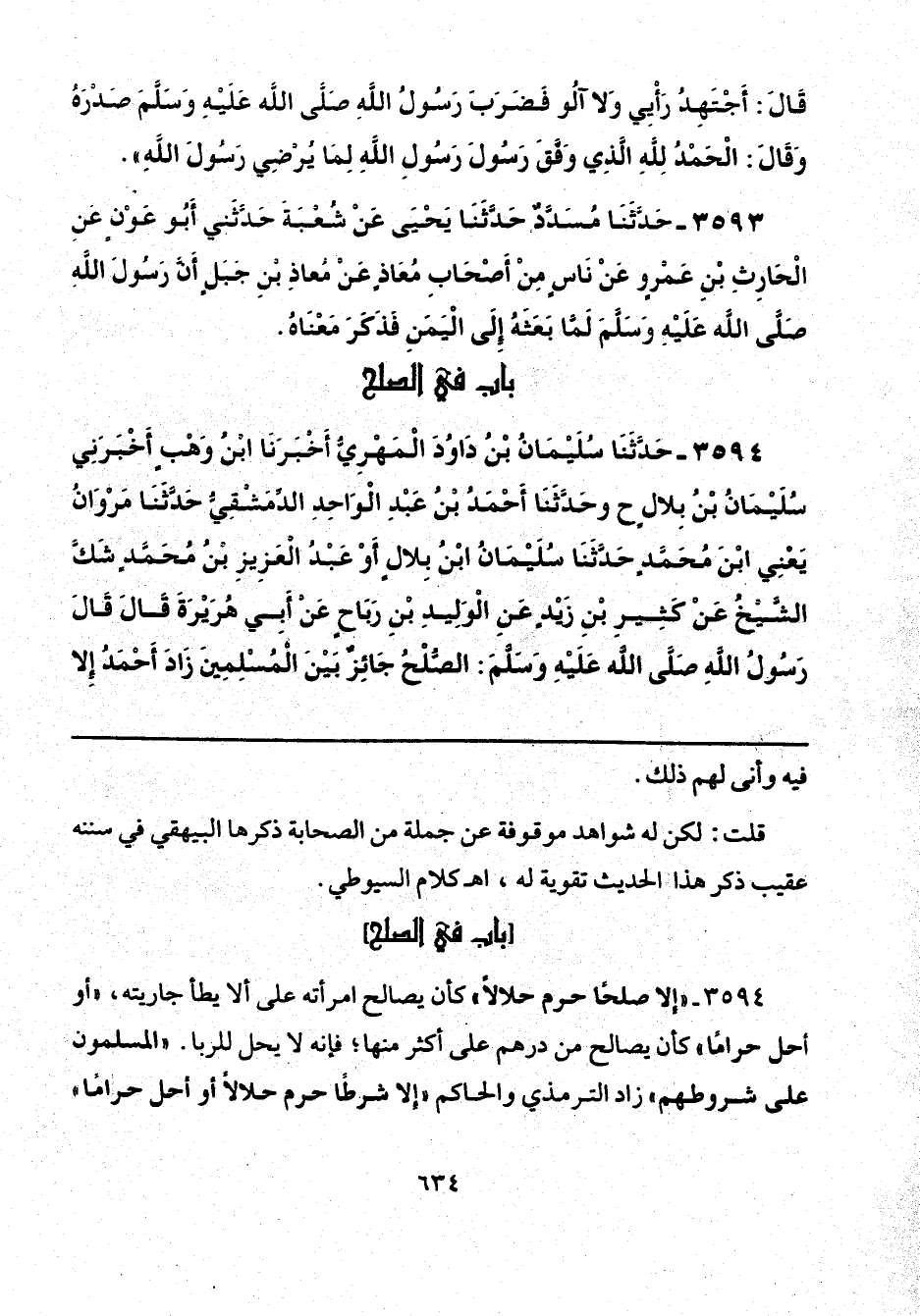 3594 - "إلا صلحًا حرم حلالًا" كأن يصالح امرأته على ألا يطأ جاريته، "أو أحل حرامًا كأن يصالح من درهم على أكثر منها؛ فإنه لا يحل للربا "المسلمون على شروطهم" زاد الترمذي والحاكم "إلا شرطًا حرم حلالًا أو أحل حرامًا"