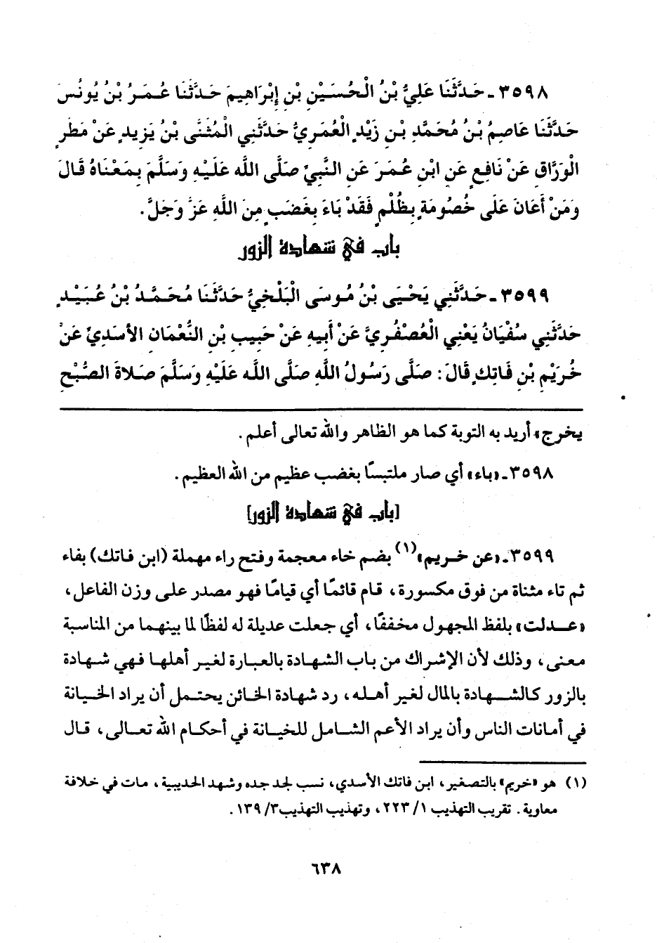 3599 - "عن خريم" (¬1) بضم خاء معجمة وفتح راء مهملة (ابن فاتك) بفاء ثم تاء مثناة من فوق مكسورة، قام قائمًا أي قيامًا فهو مصدر على وزن الفاعل، "عدلت" بلفظ المجهول مخففًا، أي جعلت عديلة له لفظًا لما بينهما من المناسبة معنى، وذلك لأن الإشراك من باب الشهادة بالعبارة لغير أهلها فهي شهادة بالزور كالشهادة بالمال لغير أهله، رد شهادة الخائن يحتمل أن يراد الخيانة في أمانات الناس وأن يراد الأعم الشامل للخيانة في أحكام الله تعالى، قال