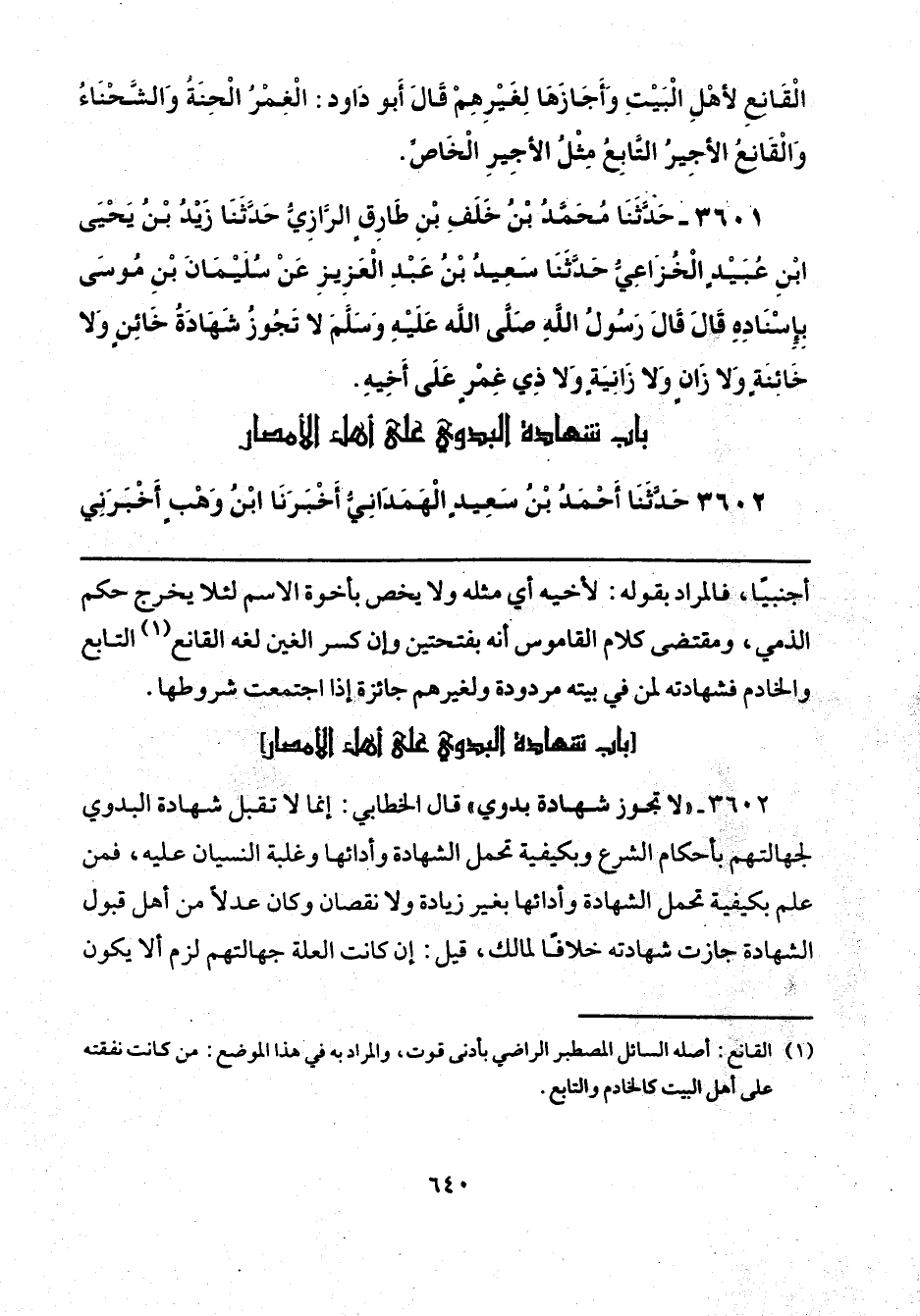 3602 - "لا تجوز شهادة بدوي" قال الخطابي: إنما لا تقبل شهادة البدوي لجهالتهم بأحكام الشرع وبكيفية تحمل الشهادة وأدائها وغلبة النسيان عليه، فمن علم بكيفية تحمل الشهادة وأدائها بغير زيادة ولا نقصان وكان عدلًا من أهل قبول الشهادة جازت شهادته خلافًا لمالك، قيل: إن كانت العلة جهالتهم لزم ألا يكون