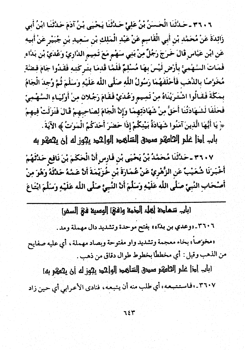 3606 - حَدَّثَنَا الْحَسَنُ بْنُ عَلِيٍّ، حَدَّثَنَا يَحْيَى بْنُ آدَمَ، حَدَّثَنَا ابْنُ أَبِي زَائِدَةَ، عَنْ مُحَمَّدِ بْنِ أَبِي الْقَاسِمِ، عَنْ عَبْدِ الْمَلِكِ بْنِ سَعِيدِ بْنِ جُبَيْرٍ، عَنْ أَبِيهِ، عَنِ ابْنِ عَبَّاسٍ، قَالَ: خَرَجَ رَجُلٌ مِنْ بَنِي سَهْمٍ مَعَ تَمِيمٍ الدَّارِيِّ وَعُدَيِّ بْنِ بَدَّاءٍ، فَمَاتَ السَّهْمِيُّ بِأَرْضٍ لَيْسَ بِهَا مُسْلِمٌ، فَلَمَّا قَدِمَا بِتَرِكَتِهِ فَقَدُوا جَامَ فِضَّةٍ مُخَوَّصًا بِالذَّهَبِ فَأَحْلَفَهُمَا رَسُولُ اللَّهِ صَلَّى اللهُ عَلَيْهِ وَسَلَّمَ، ثُمَّ وُجِدَ الْجَامُ بِمَكَّةَ، فَقَالُوا: اشْتَرَيْنَاهُ مِنْ تَمِيمٍ وَعُدَيٍّ فَقَامَ رَجُلَانِ مِنْ أَوْلِيَاءِ السَّهْمِيِّ، فَحَلَفَا لَشَهَادَتُنَا أَحَقُّ مِنْ شَهَادَتِهِمَا، وَإِنَّ الْجَامَ لِصَاحِبِهِمْ قَالَ: فَنَزَلَتْ فِيهِمْ {يَا أَيُّهَا الَّذِينَ آمَنُوا شَهَادَةُ بَيْنِكُمْ إِذَا حَضَرَ أَحَدَكُمُ الْمَوْتُ} [المائدة: 106] الْآيَةَ.