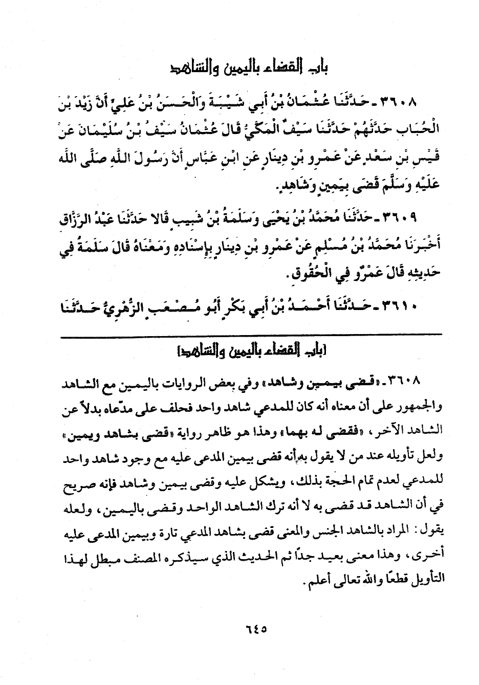 3608 - "قضى بيمين وشاهد" وفي بعض الروايات باليمين مع الشاهد والجمهور على أن معناه أنه كان للمدعي شاهد واحد فحلف على مدعاه بدلا عن الشاهد الآخر، "فقضى له بهما" وهذا هو ظاهر رواية قضي بشاهد ويمين" ولعل تأويله عند من لا يقول به إنه قضى بيمين المدعى عليه مع وجود شاهد واحد للمدعي لعدم تمام الحجة بذلك، ويشكل عليه وقضى بيمين وشاهد فإنه صريح في أن الشاهد قد قضى به لا أنه ترك الشاهد الواحد وقضى باليمين، ولعله يقول: المراد بالشاهد الجنس والمعنى قضى بشاهد المدعي تارة وبيمين المدعى عليه أخرى، وهذا معنى بعيد جدًّا ثم الحديث الذي سيذكره المصنف مبطل لهذا التأويل قطعًا والله تعالى أعلم.