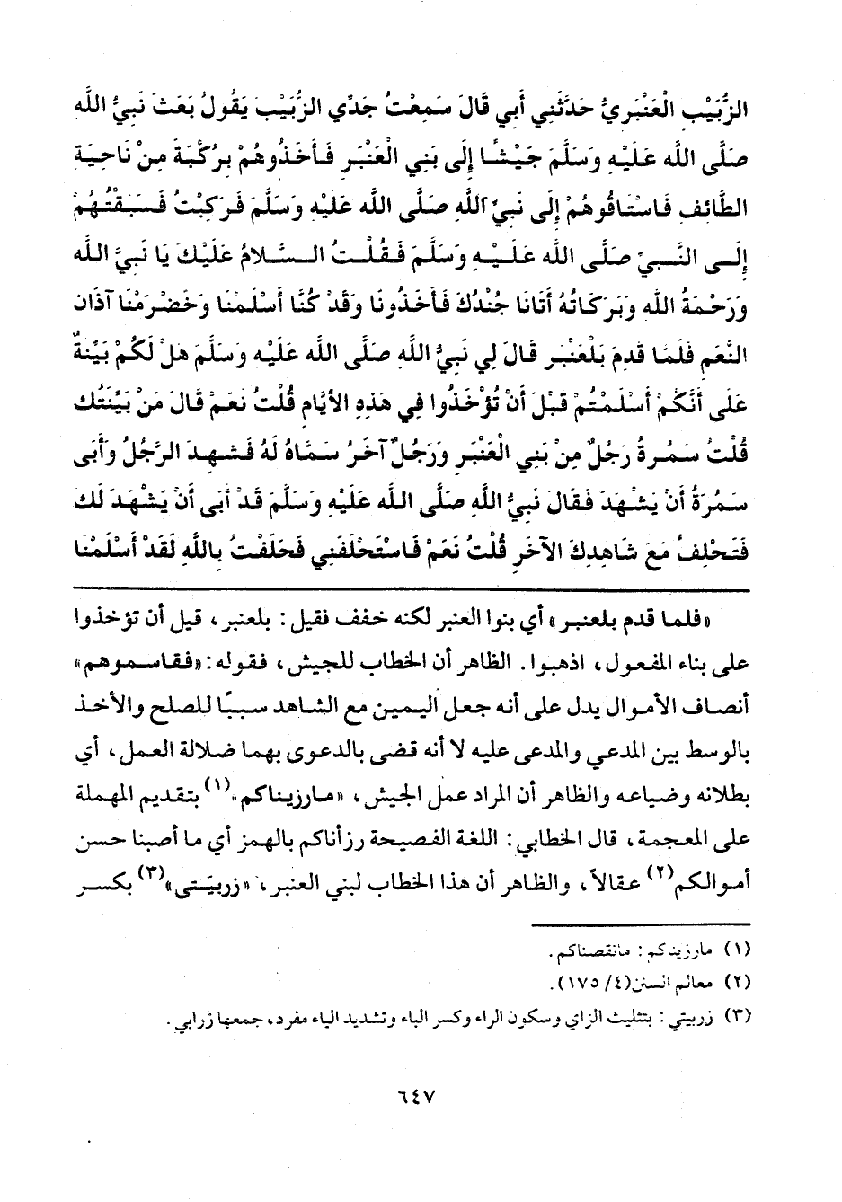 الزُّبَيْبِ الْعَنْبَرِيُّ، حَدَّثَنِي أَبِي، قَالَ: سَمِعْتُ جَدِّي الزُّبَيْبَ، يَقُولُ بَعَثَ نَبِيُّ اللَّهِ صَلَّى اللهُ عَلَيْهِ وَسَلَّمَ جَيْشًا إِلَى بَنِي الْعَنْبَرِ فَأَخَذُوهُمْ بِرُكْبَةَ مِنْ نَاحِيَةِ الطَّائِفِ فَاسْتَاقُوهُمْ إِلَى نَبِيِّ اللَّهِ صَلَّى اللهُ عَلَيْهِ وَسَلَّمَ، فَرَكِبْتُ فَسَبَقْتُهُمْ إِلَى النَّبِيِّ صَلَّى اللهُ عَلَيْهِ وَسَلَّمَ، فَقُلْتُ: السَّلَامُ عَلَيْكَ يَا نَبِيَّ اللَّهِ وَرَحْمَةُ اللَّهِ وَبَرَكَاتُهُ، أَتَانَا جُنْدُكَ فَأَخَذُونَا وَقَدْ كُنَّا أَسْلَمْنَا وَخَضْرَمْنَا آذَانَ النَّعَمِ، فَلَمَّا قَدِمَ بَلْعَنْبَرِ، قَالَ لِي نَبِيُّ اللَّهِ صَلَّى اللهُ عَلَيْهِ وَسَلَّمَ: «هَلْ لَكُمْ بَيِّنَةٌ عَلَى أَنَّكُمْ أَسْلَمْتُمْ قَبْلَ أَنْ تُؤْخَذُوا فِي هَذِهِ الْأَيَّامِ؟ » قُلْتُ: نَعَمْ، قَالَ: «مَنْ بَيِّنَتُكَ؟ » قُلْتُ: سَمُرَةُ رَجُلٌ مِنْ بَنِي الْعَنْبَرِ وَرَجُلٌ آخَرُ سَمَّاهُ لَهُ فَشَهِدَ الرَّجُلُ، وَأَبَى سَمُرَةُ أَنْ يَشْهَدَ، فَقَالَ نَبِيُّ اللَّهِ صَلَّى اللهُ عَلَيْهِ وَسَلَّمَ: «قَدْ أَبَى أَنْ يَشْهَدَ لَكَ، فَتَحْلِفُ مَعَ شَاهِدِكَ الْآخَرِ؟ » قُلْتُ: نَعَمْ، فَاسْتَحْلَفَنِي، فَحَلَفْتُ بِاللَّهِ لَقَدْ أَسْلَمْنَا