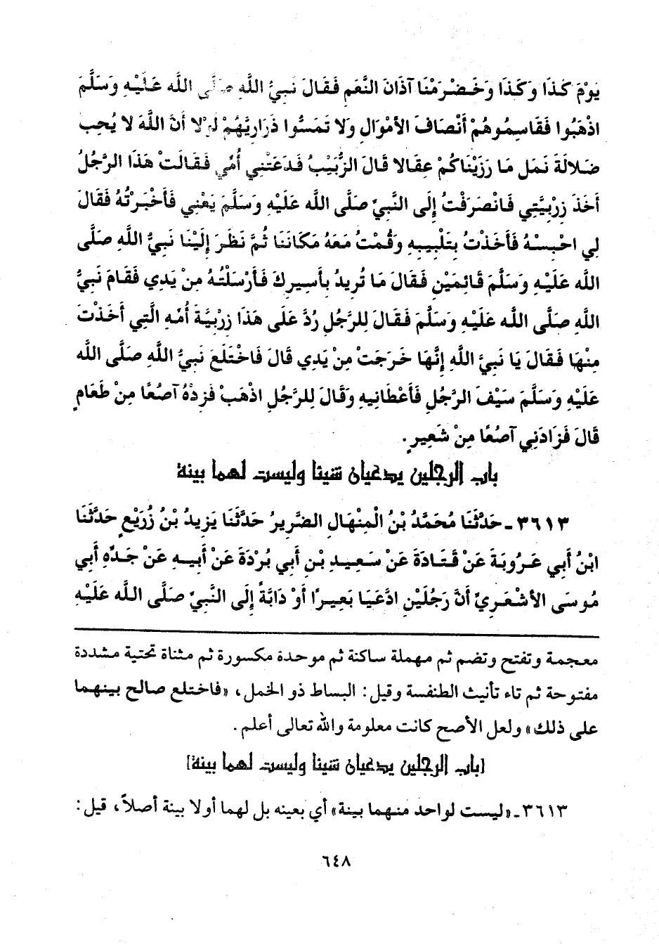 3613 - حَدَّثَنَا مُحَمَّدُ بْنُ الْمِنْهَالِ الضَّرِيرُ، حَدَّثَنَا يَزِيدُ بْنُ زُرَيْعٍ، حَدَّثَنَا ابْنُ أَبِي عَرُوبَةَ، عَنْ قَتَادَةَ، عَنْ سَعِيدِ بْنِ أَبِي بُرْدَةَ، عَنْ أَبِيهِ، عَنْ جَدِّهِ أَبِي مُوسَى الْأَشْعَرِيِّ: «أَنَّ رَجُلَيْنِ ادَّعَيَا بَعِيرًا أَوْ دَابَّةً إِلَى النَّبِيِّ صَلَّى اللهُ عَلَيْهِ