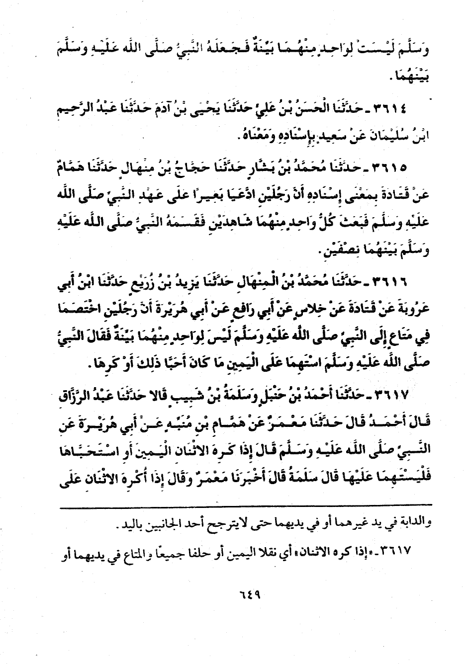 3615 - حَدَّثَنَا مُحَمَّدُ بْنُ بَشَّارٍ، حَدَّثَنَا حَجَّاجُ بْنُ مِنْهَالٍ، حَدَّثَنَا هَمَّامٌ، عَنْ قَتَادَةَ بِمَعْنَى إِسْنَادِهِ أَنَّ رَجُلَيْنِ ادَّعَيَا بَعِيرًا عَلَى عَهْدِ النَّبِيِّ صَلَّى اللهُ عَلَيْهِ وَسَلَّمَ فَبَعَثَ كُلُّ وَاحِدٍ مِنْهُمَا شَاهِدَيْنِ فَقَسَمَهُ النَّبِيُّ صَلَّى اللهُ عَلَيْهِ وَسَلَّمَ بَيْنَهُمَا نِصْفَيْنِ.
