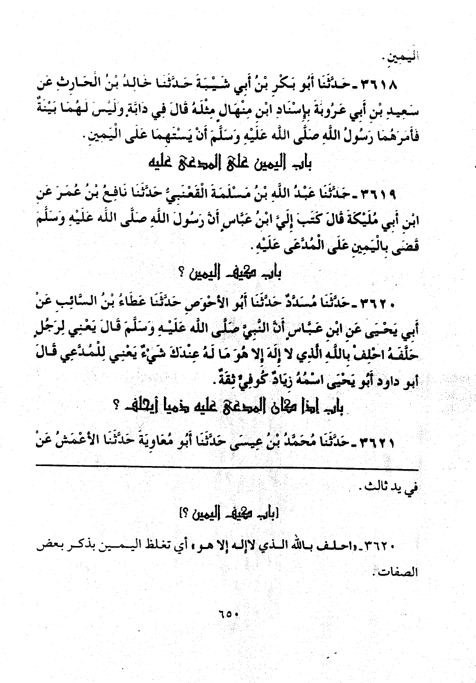 3619 - حَدَّثَنَا عَبْدُ اللَّهِ بْنُ مَسْلَمَةَ الْقَعْنَبِيُّ، حَدَّثَنَا نَافِعُ بْنُ عُمَرَ، عَنِ ابْنِ أَبِي مُلَيْكَةَ، قَالَ: كَتَبَ إِلَيَّ ابْنُ عَبَّاسٍ: «أَنَّ رَسُولَ اللَّهِ صَلَّى اللهُ عَلَيْهِ وَسَلَّمَ قَضَى بِالْيَمِينِ عَلَى الْمُدَّعَى عَلَيْهِ».