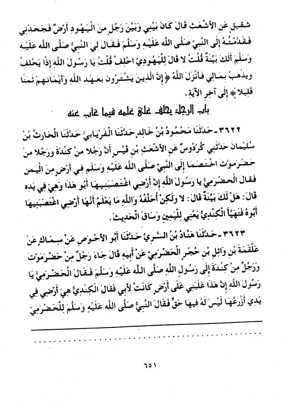 3623 - حَدَّثَنَا هَنَّادُ بْنُ السَّرِيِّ، حَدَّثَنَا أَبُو الْأَحْوَصِ، عَنْ سِمَاكٍ، عَنْ عَلْقَمَةَ بْنِ وَائِلِ بْنِ حُجْرٍ الْحَضْرَمِيِّ، عَنْ أَبِيهِ، قَالَ: جَاءَ رَجُلٌ مِنْ حَضْرَمَوْتَ وَرَجُلٌ مِنْ كِنْدَةَ، إِلَى رَسُولِ اللَّهِ صَلَّى اللهُ عَلَيْهِ وَسَلَّمَ فَقَالَ: الْحَضْرَمِيُّ، يَا رَسُولَ اللَّهِ، إِنَّ هَذَا غَلَبَنِي عَلَى أَرْضٍ كَانَتْ لِأَبِي، فَقَالَ الْكِنْدِيُّ: هِيَ أَرْضِي فِي يَدِي أَزْرَعُهَا لَيْسَ لَهُ فِيهَا حَقٌّ، فَقَالَ النَّبِيُّ صَلَّى اللهُ عَلَيْهِ وَسَلَّمَ لِلْحَضْرَمِيِّ: