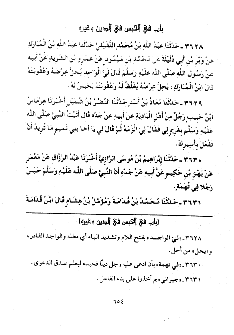 3628 - حَدَّثَنَا عَبْدُ اللَّهِ بْنُ مُحَمَّدٍ النُّفَيْلِيُّ، حَدَّثَنَا عَبْدُ اللَّهِ بْنُ الْمُبَارَكِ، عَنْ وَبْرِ بْنِ أَبِي دُلَيْلَةَ، عَنْ مُحَمَّدِ بْنِ مَيْمُونٍ، عَنْ عَمْرِو بْنِ الشَّرِيدِ، عَنْ أَبِيهِ، عَنْ رَسُولِ اللَّهِ صَلَّى اللهُ عَلَيْهِ وَسَلَّمَ قَالَ: «لَيُّ الْوَاجِدِ يُحِلُّ عِرْضَهُ، وَعُقُوبَتَهُ» قَالَ ابْنُ الْمُبَارَكِ: «يُحِلُّ عِرْضُهُ يُغَلَّظُ لَهُ، وَعُقُوبَتَهُ يُحْبَسُ لَهُ».