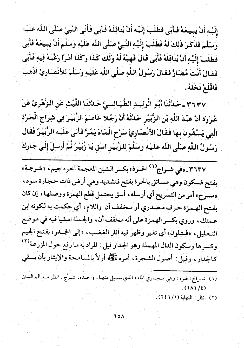 3637 - حَدَّثَنَا أَبُو الْوَلِيدِ الطَّيَالِسِيُّ، حَدَّثَنَا اللَّيْثِ، عَنِ الزُّهْرِيِّ، عَنْ عُرْوَةَ، أَنَّ عَبْدَ اللَّهِ بْنَ الزُّبَيْرِ، حَدَّثَهُ أَنَّ رَجُلًا خَاصَمَ الزُّبَيْرَ فِي شِرَاجِ الْحَرَّةِ الَّتِي يَسْقُونَ بِهَا فَقَالَ الْأَنْصَارِيُّ: سَرِّحِ الْمَاءَ يَمُرُّ فَأَبَى عَلَيْهِ الزُّبَيْرُ، فَقَالَ رَسُولُ اللَّهِ صَلَّى اللهُ عَلَيْهِ وَسَلَّمَ لِلزُّبَيْرِ: «اسْقِ يَا زُبَيْرُ، ثُمَّ أَرْسِلْ إِلَى جَارِكَ»،