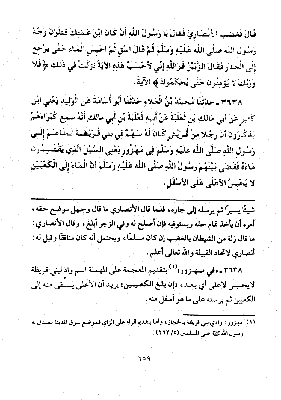 3638 - حَدَّثَنَا مُحَمَّدُ بْنُ الْعَلَاءِ، حَدَّثَنَا أَبُو أُسَامَةَ، عَنِ الْوَلِيدِ يَعْنِي ابْنَ كَثِيرٍ، عَنْ أَبِي مَالِكِ بْنِ ثَعْلَبَةَ، عَنْ أَبِيهِ ثَعْلَبَةَ بْنِ أَبِي مَالِكٍ، أَنَّهُ سَمِعَ كُبَرَاءَهُمْ، يَذْكُرُونَ أَنَّ رَجُلًا مِنْ قُرَيْشٍ كَانَ لَهُ سَهْمٌ فِي بَنِي قُرَيْظَةَ، فَخَاصَمَ إِلَى رَسُولِ اللَّهِ صَلَّى اللهُ عَلَيْهِ وَسَلَّمَ فِي مَهْزُورٍ يَعْنِي السَّيْلَ الَّذِي يَقْتَسِمُونَ مَاءَهُ: «فَقَضَى بَيْنَهُمْ رَسُولُ اللَّهِ صَلَّى اللهُ عَلَيْهِ وَسَلَّمَ أَنَّ الْمَاءَ إِلَى الْكَعْبَيْنِ لَا يَحْبِسُ الْأَعْلَى عَلَى الْأَسْفَلِ».