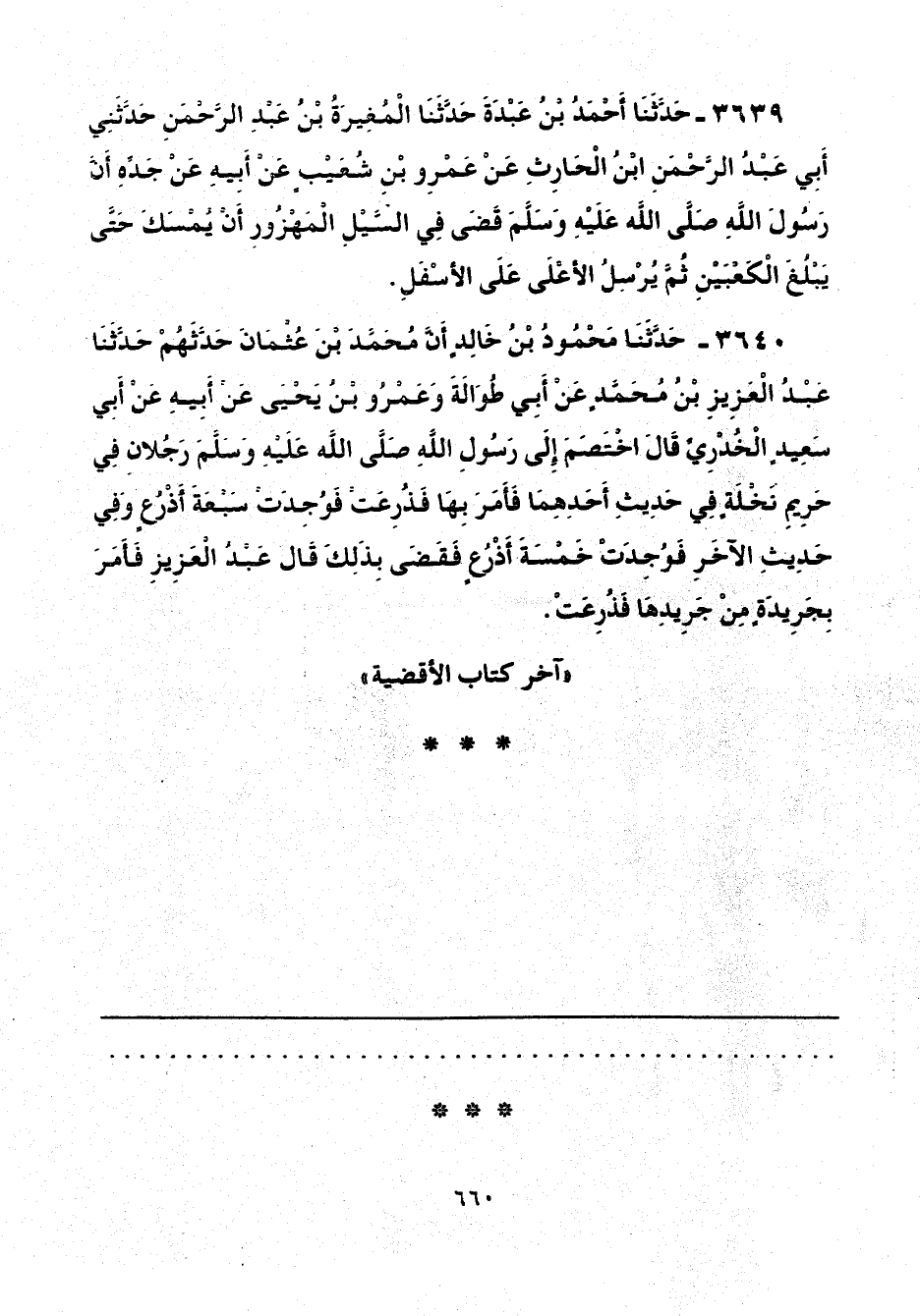 3639 - حَدَّثَنَا أَحْمَدُ بْنُ عَبْدَةَ، حَدَّثَنَا الْمُغِيرَةُ بْنُ عَبْدِ الرَّحْمَنِ، حَدَّثَنِي أَبِي عَبْدُ الرَّحْمَنِ بْنُ الْحَارِثِ، عَنْ عَمْرِو بْنِ شُعَيْبٍ، عَنْ أَبِيهِ، عَنْ جَدِّهِ: «أَنَّ رَسُولَ اللَّهِ صَلَّى اللهُ عَلَيْهِ وَسَلَّمَ قَضَى فِي السَّيْلِ الْمَهْزُورِ أَنْ يُمْسَكَ حَتَّى يَبْلُغَ الْكَعْبَيْنِ، ثُمَّ يُرْسِلُ الْأَعْلَى عَلَى الْأَسْفَلِ».