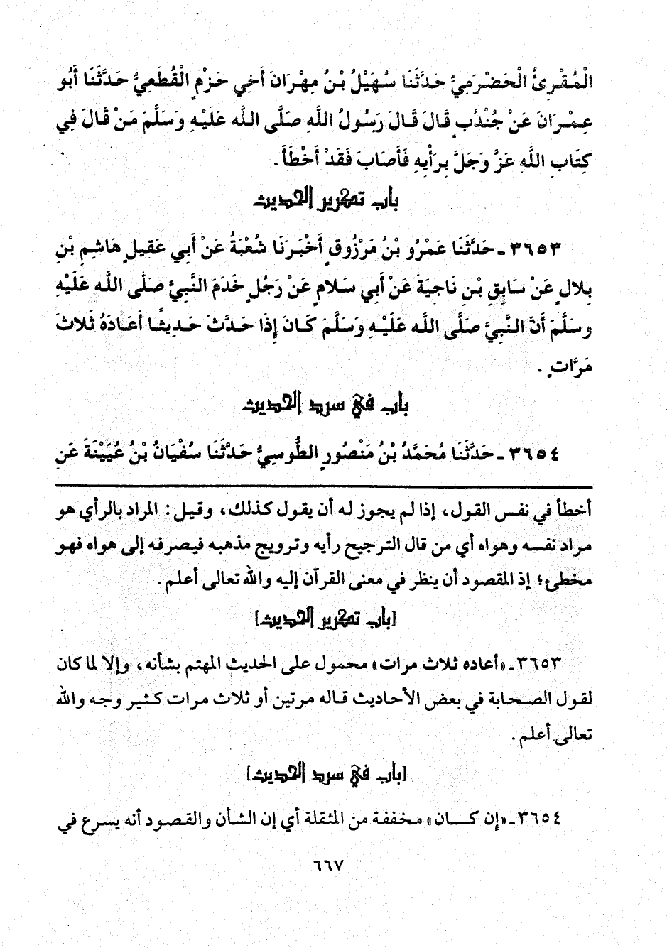 3653 - "أعاده ثلاث مرات" محمول على الحديث المهتم بشأنه، وإلا لما كان لقول الصحابة في بعض الأحاديث قاله مرتين أو ثلاث مرات كثير وجه والله تعالى أعلم.