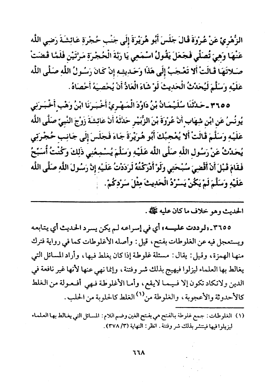 3655 - حَدَّثَنَا سُلَيْمَانُ بْنُ دَاوُدَ الْمَهْرِيُّ، أَخْبَرَنَا ابْنُ وَهْبٍ، أَخْبَرَنِي يُونُسُ، عَنِ ابْنِ شِهَابٍ، أَنَّ عُرْوَةَ بْنَ الزُّبَيْرِ، حَدَّثَهُ أَنَّ عَائِشَةَ زَوْجَ النَّبِيِّ صَلَّى اللهُ عَلَيْهِ وَسَلَّمَ قَالَتْ: أَلَا يُعْجِبُكَ أَبُو هُرَيْرَةَ جَاءَ فَجَلَسَ إِلَى جَانِبِ حُجْرَتِي يُحَدِّثُ عَنْ رَسُولِ اللَّهِ صَلَّى اللهُ عَلَيْهِ وَسَلَّمَ، يُسْمِعُنِي ذَلِكَ وَكُنْتُ أُسَبِّحُ، فَقَامَ، قَبْلَ أَنْ أَقْضِيَ سُبْحَتِي وَلَوْ أَدْرَكْتُهُ لَرَدَدْتُ عَلَيْهِ: «إِنَّ رَسُولَ اللَّهِ صَلَّى اللهُ عَلَيْهِ وَسَلَّمَ لَمْ يَكُنْ يَسْرُدُ الْحَدِيثَ مِثْلَ سَرْدِكُمْ».