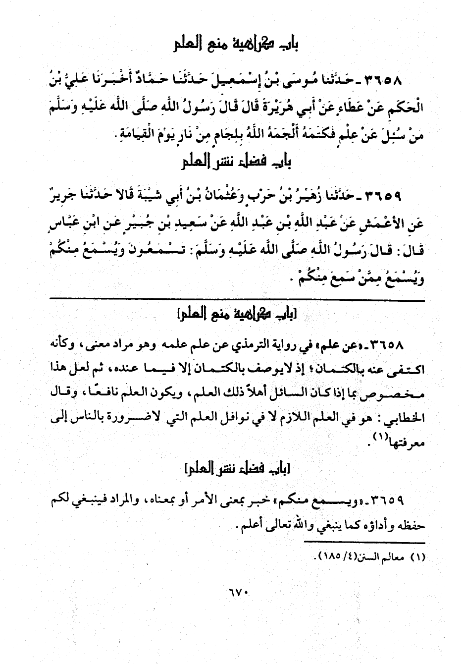 3658 - "عن علم" في رواية الترمذي عن علم علمه وهو مراد معنى، وكأنه اكتفى عنه بالكتمان؛ إذ لا يوصف بالكتمان إلا فيما عنده، ثم لعل هذا مخصوص بما إذا كان السائل أهلًا ذلك العلم، ويكون العلم نافعًا، وقال الخطابي: هو في العلم اللازم لا في نوافل العلم التي لا ضرورة بالناس إلى معرفتها (¬1).