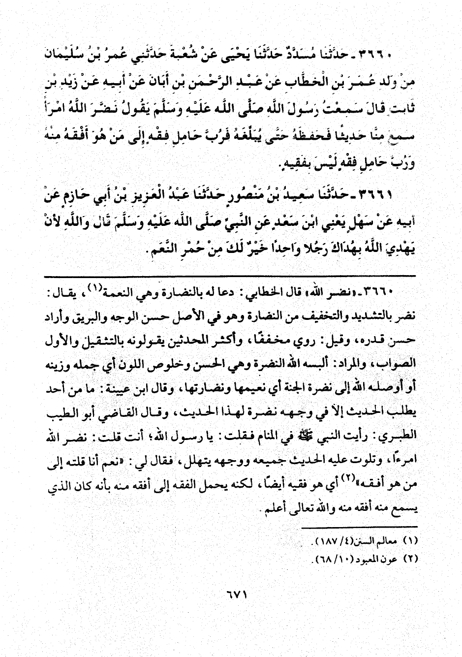 3660 - "نضر الله" قال الخطابي: دعا له بالنضارة وهي النعمة (¬1)، يقال: نضر بالتشديد والتخفيف من النضارة وهو في الأصل حسن الوجه والبريق وأراد حسن قدره، وقيل: روي مخففًا، وأكثر المحدثين يقولونه بالتثقيل والأول الصواب، والمراد: ألبسه الله النضرة وهي الحسن وخلوص اللون أي جمله وزينه أو أوصله الله إلى نضرة الجنة أي نعيمها ونضارتها، وقال ابن عيينة: ما من أحد يطلب الحديث إلا في وجهه نضرة لهذا الحديث، وقال القاضي أبو الطيب الطبري: رأيت النبي - صلى الله عليه وسلم - في المنام فقلت: يا رسول الله؛ أنت قلت: نضر الله امرءًا، وتلوت عليه الحديث جميعة ووجهه يتهلل، فقال لي: "نعم أنا قلته إلى من هو أفقه" (¬2) أي هو فقيه أيضًا، لكنه يحمل الفقه إلى أفقه منه بأنه كان الذي يسمع منه أفقه منه والله تعالى أعلم.