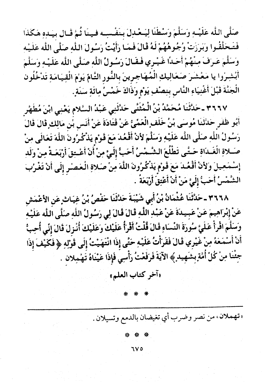 3668 - حَدَّثَنَا عُثْمَانُ بْنُ أَبِي شَيْبَةَ، حَدَّثَنَا حَفْصُ بْنُ غِيَاثٍ، عَنِ الْأَعْمَشِ، عَنْ إِبْرَاهِيمَ، عَنْ عَبِيدَةَ، عَنْ عَبْدِ اللَّهِ، قَالَ: قَالَ لِي رَسُولُ اللَّهِ صَلَّى اللهُ عَلَيْهِ وَسَلَّمَ: «اقْرَأْ عَلَيَّ سُورَةَ النِّسَاءِ» قَالَ: قُلْتُ: أَقْرَأُ عَلَيْكَ وَعَلَيْكَ أُنْزِلَ، قَالَ: «إِنِّي أُحِبُّ أَنْ أَسْمَعَهُ مِنْ غَيْرِي»، قَالَ: فَقَرَأْتُ عَلَيْهِ حَتَّى إِذَا انْتَهَيْتُ إِلَى قَوْلِهِ {فَكَيْفَ إِذَا جِئْنَا مِنْ كُلِّ أُمَّةٍ بِشَهِيدٍ} [النساء: 41] الْآيَةَ، فَرَفَعْتُ رَأْسِي فَإِذَا عَيْنَاهُ تَهْمِلَانِ.