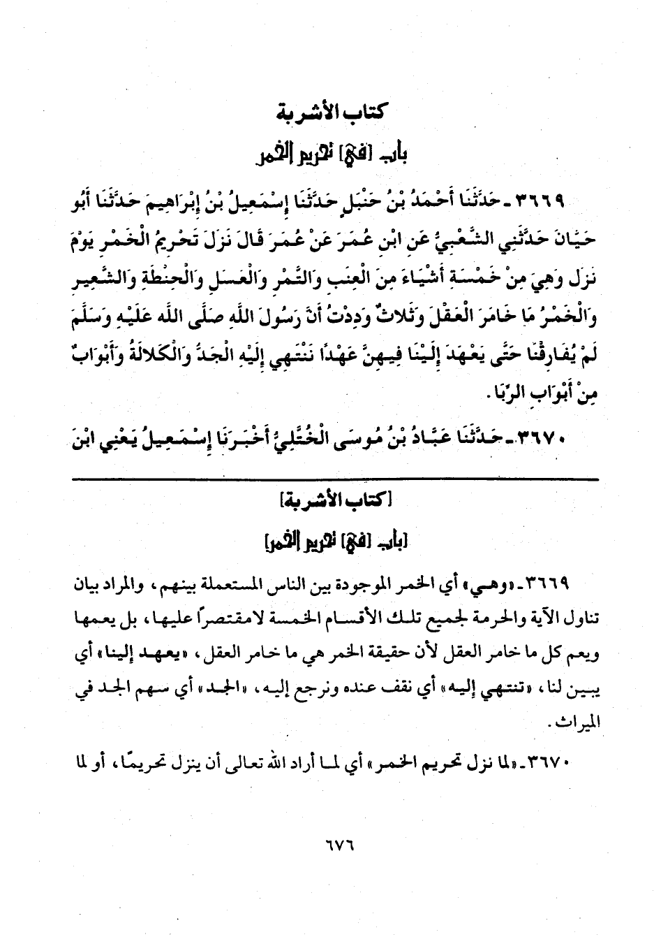 3669 - "وهي" أي الخمر الموجودة بين الناس المستعملة بينهم، والمراد بيان تناول الآية والحرمة لجميع تلك الأقسام الخمسة لا مقتصرًا عليها، بل يعمها ويعم كل ما خامر العقل لأن حقيقة الخمر هي ما خامر العقك، "يعهد إلينا" أي يبين لنا، "تنتهي إِليه" أي نقف عنده ونرجع إليه، "الجد" أي سهم الجد في الميراث.
