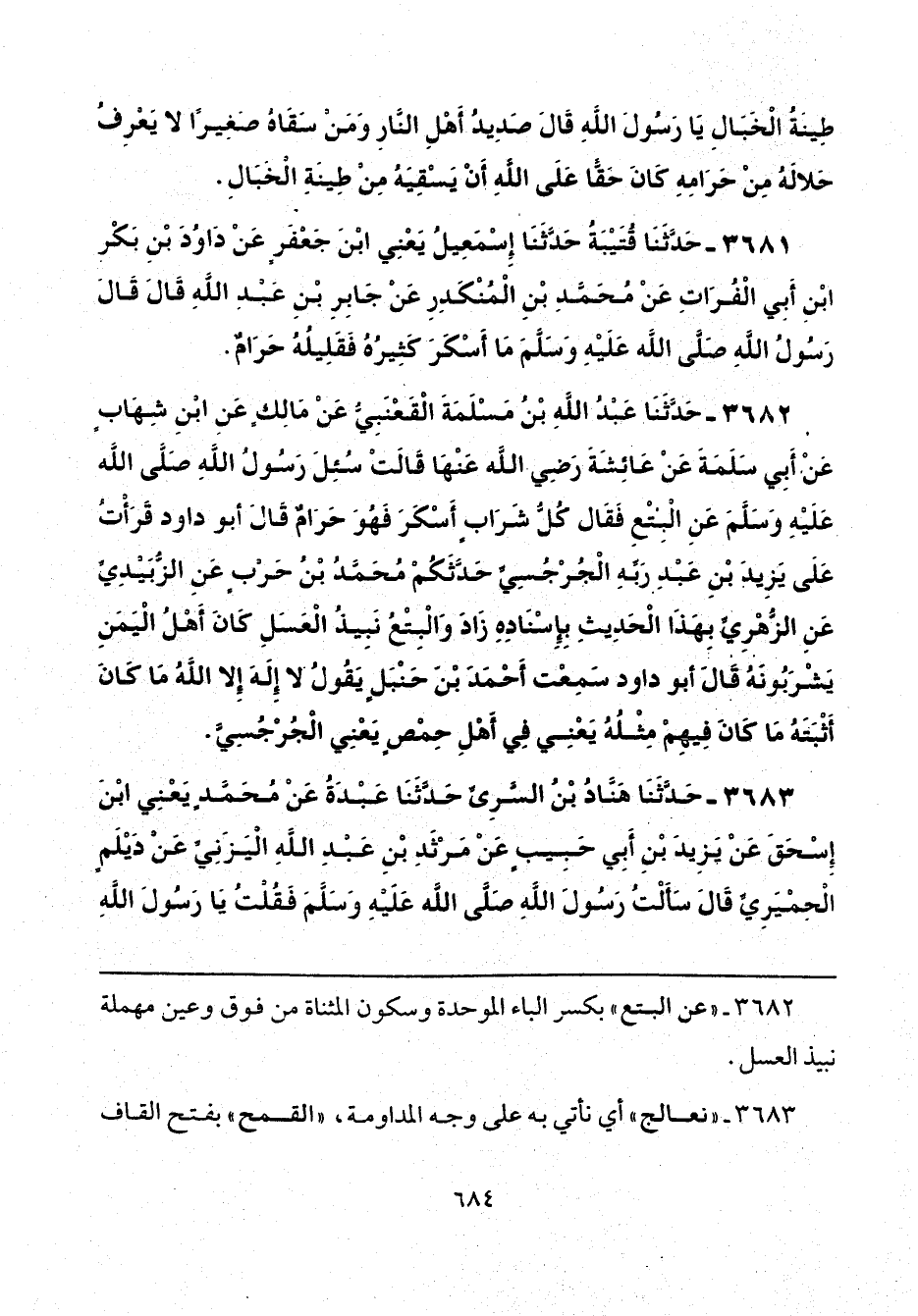 3682 - حَدَّثَنَا عَبْدُ اللَّهِ بْنُ مَسْلَمَةَ الْقَعْنَبِيُّ، عَنْ مَالِكٍ، عَنِ ابْنِ شِهَابٍ، عَنْ أَبِي سَلَمَةَ، عَنْ عَائِشَةَ رَضِيَ اللَّهُ عَنْهَا، قَالَتْ: سُئِلَ رَسُولُ اللَّهِ صَلَّى اللهُ عَلَيْهِ وَسَلَّمَ عَنِ البِتْعِ فَقَالَ: «كُلُّ شَرَابٍ أَسْكَرَ فَهُوَ حَرَامٌ» قَالَ أَبُو دَاوُدَ: قَرَأْتُ عَلَى يَزِيدَ بْنِ عَبْدِ رَبِّهِ الْجُرْجُسِيِّ، حَدَّثَكُمْ مُحَمَّدُ بْنُ حَرْبٍ، عَنِ الزُّبَيْدِيِّ، عَنِ الزُّهْرِيِّ بِهَذَا الْحَدِيثِ بِإِسْنَادِهِ، زَادَ: وَالْبِتْعُ نَبِيذُ الْعَسَلِ، كَانَ أَهْلُ الْيَمَنِ يَشْرَبُونَهُ. قَالَ أَبُو دَاوُدَ: سَمِعْت أَحْمَدَ بْنَ حَنْبَلٍ يَقُولُ: لَا إِلَهَ إِلَّا اللَّهُ مَا كَانَ أَثْبَتَهُ مَا كَانَ فِيهِمْ مِثْلُهُ يَعْنِي فِي أَهْلِ حِمْصٍ يَعْنِي الْجُرْجُسِيَّ.