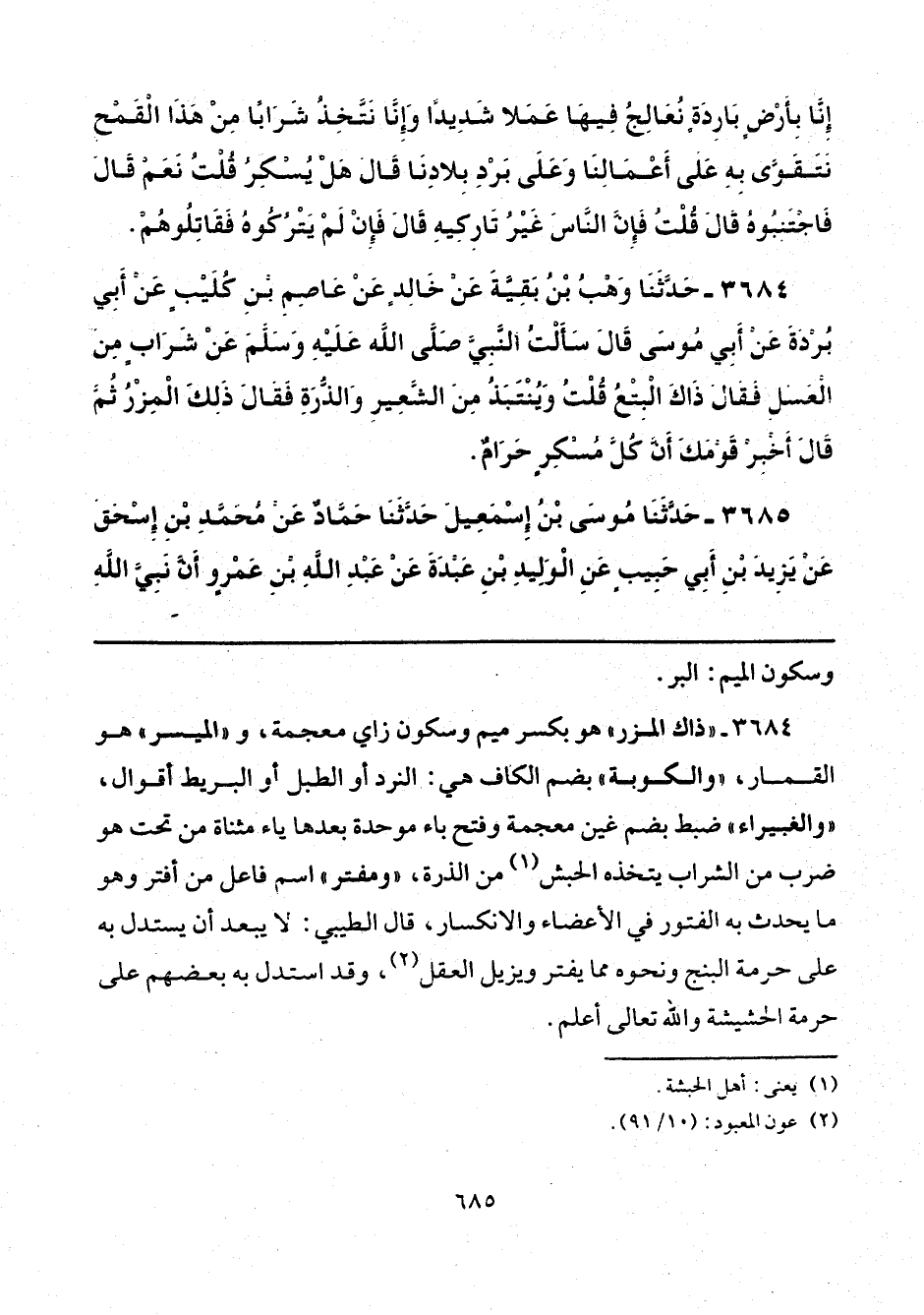 3684 - "ذاك المزر" هو بكسر ميم وسكون زاي معجمة، و"الميسر" هو القمار، "والكوبة" بضم الكاف هي: النرد أو الطبل أو البريط أقوال، "والغبيراء" ضبط بضم غين معجمة وفتح باء موحدة بعدها ياء مثناة من تحت هو ضرب من الشراب يتخذه الحبش (¬1) من الذرة، "ومفتر" اسم فاعل من أفتر وهو ما يحدث به الفتور في الأعضاء والانكسار، قال الطيبي: لا يبعد أن يستدل به على حرمة البنج ونحوه مما يفتر ويزيل العقل (¬2)، وقد استدل به بعضهم على حرمة الحشيشة والله تعالى أعلم.